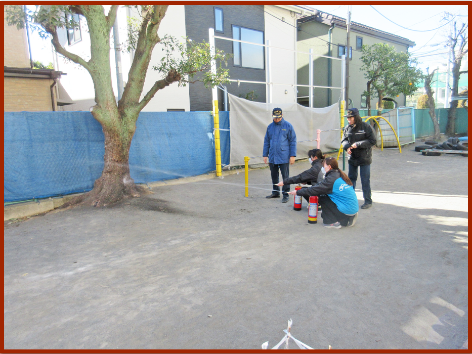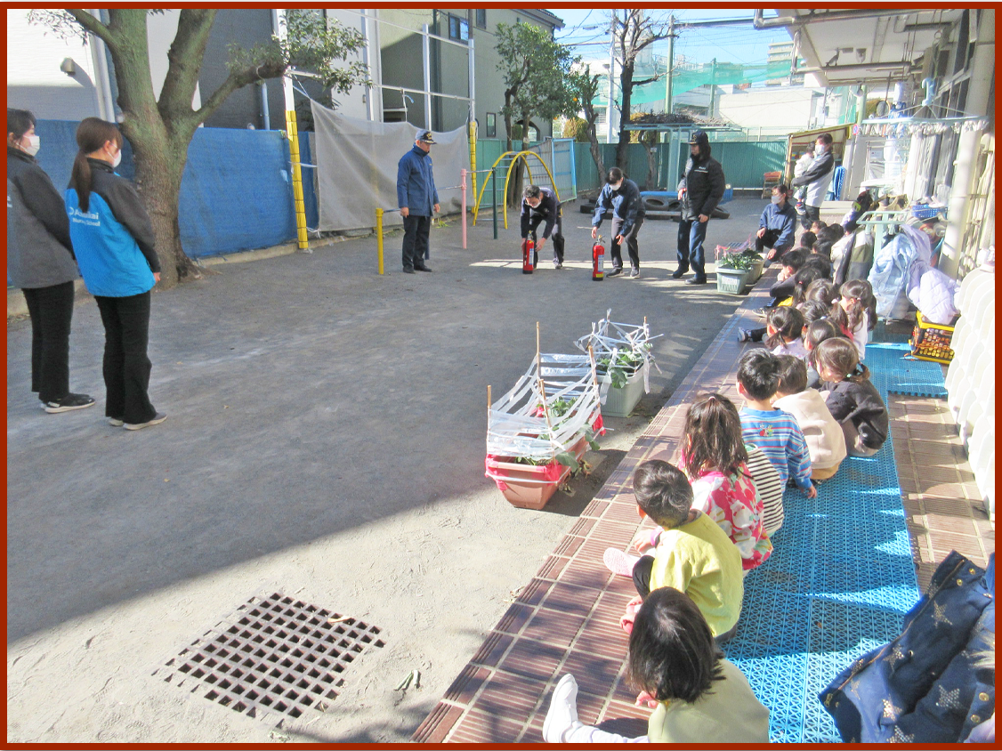 今日は、避難訓練後に園庭で消防士立ち合いの消火訓練を行いました。見学をしたたんぽぽ組、ひまわり組さんは、消防士さんの合図に合わせて「火事だ」と大きな声で知らせる事が出来ました。