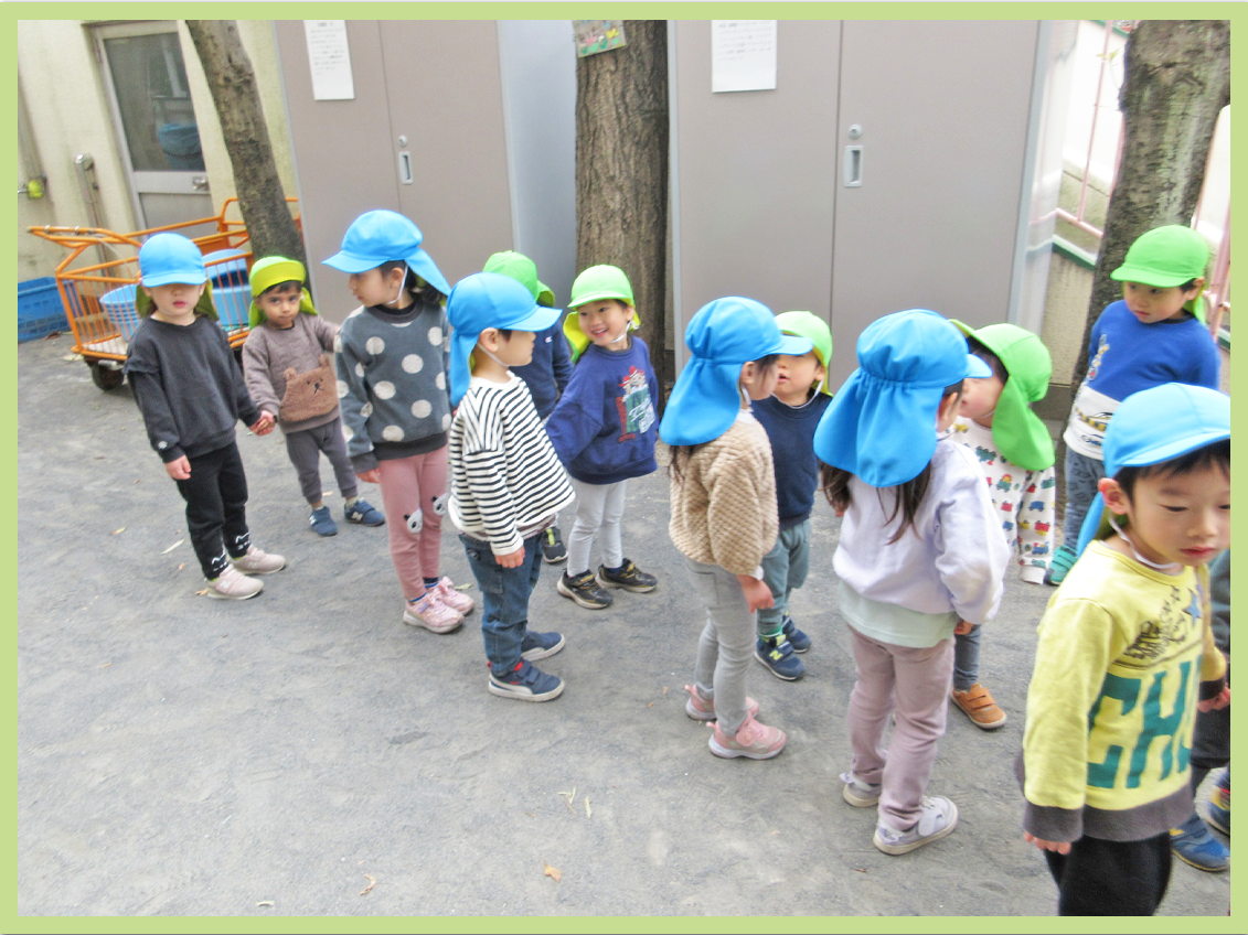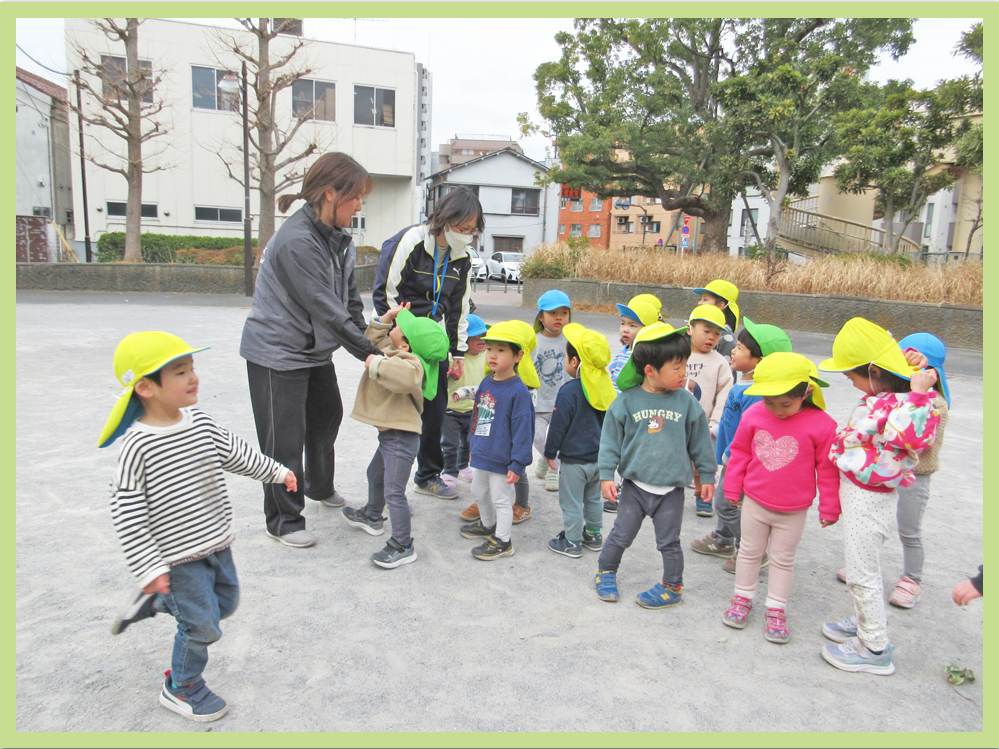 お兄さんお姉さんと手を繋ぐ際は、少し緊張しながらもしっかりと手を繋ぐ事が出来ました。公園では、外が寒かった事もあり保育者が鬼になり、こどもたちを捕まえる鬼ごっこをして体を温めました。こどもたちは、保育者に捕まらないように必死に逃げていてとても可愛らしかったです。