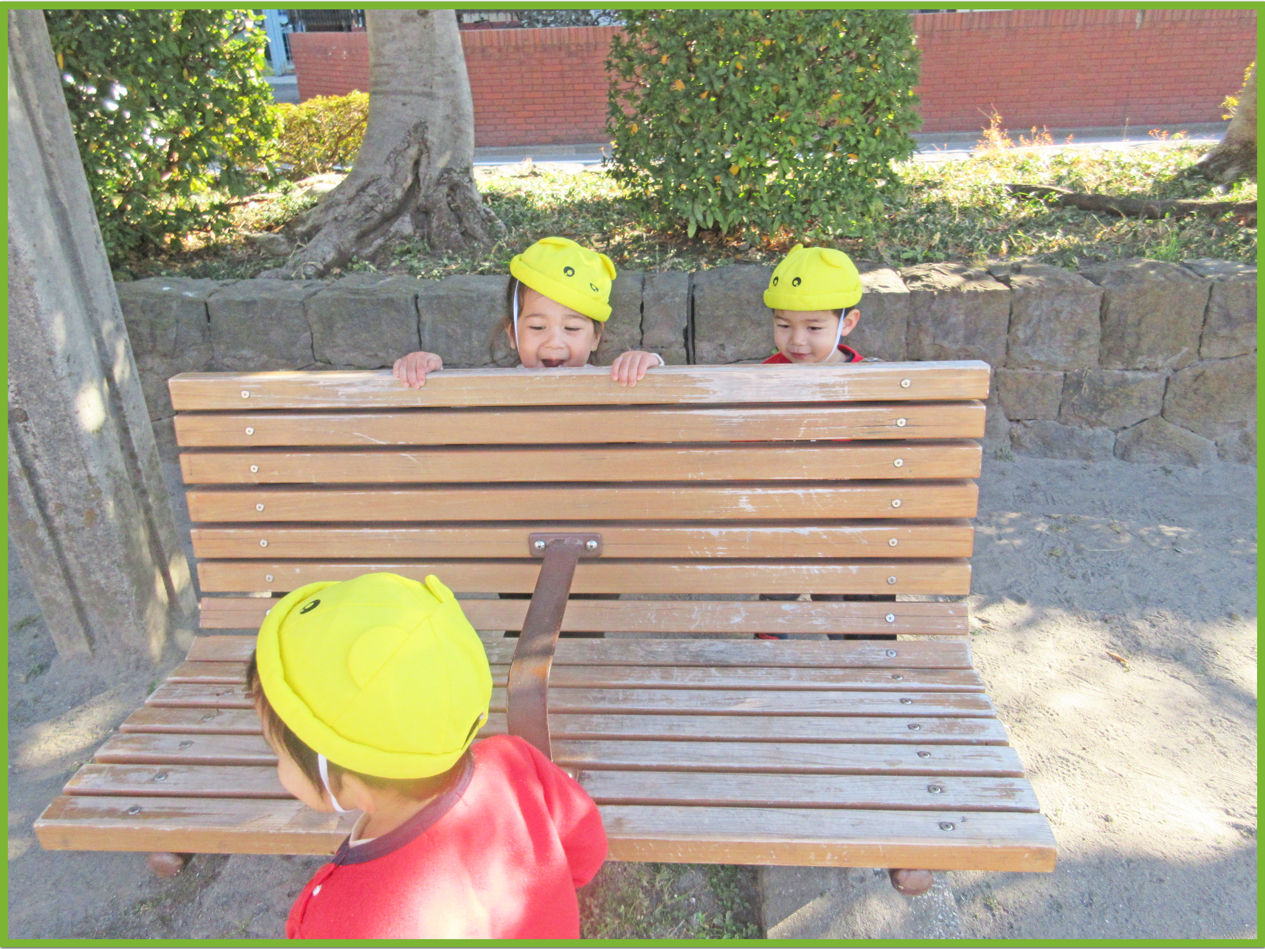 かくれんぼでは、ベンチの後ろに隠れると、「いないいないばあっ」と言いながら顔をひょっこり覗かせて、お友だちと目が合うとケラケラと楽しそうに笑っていました。