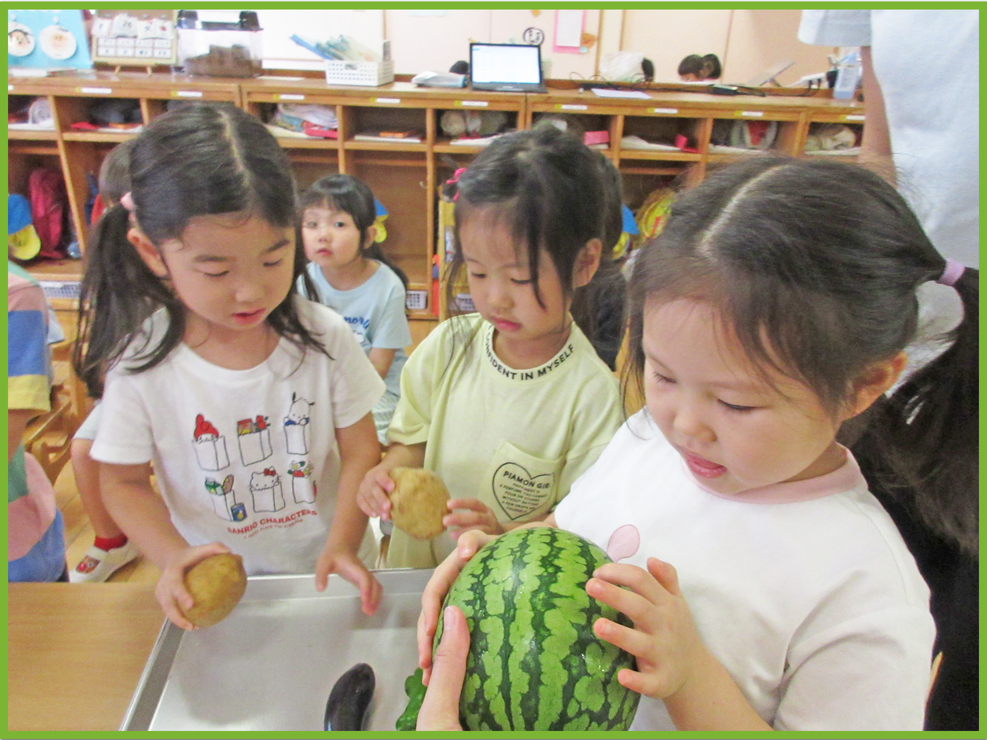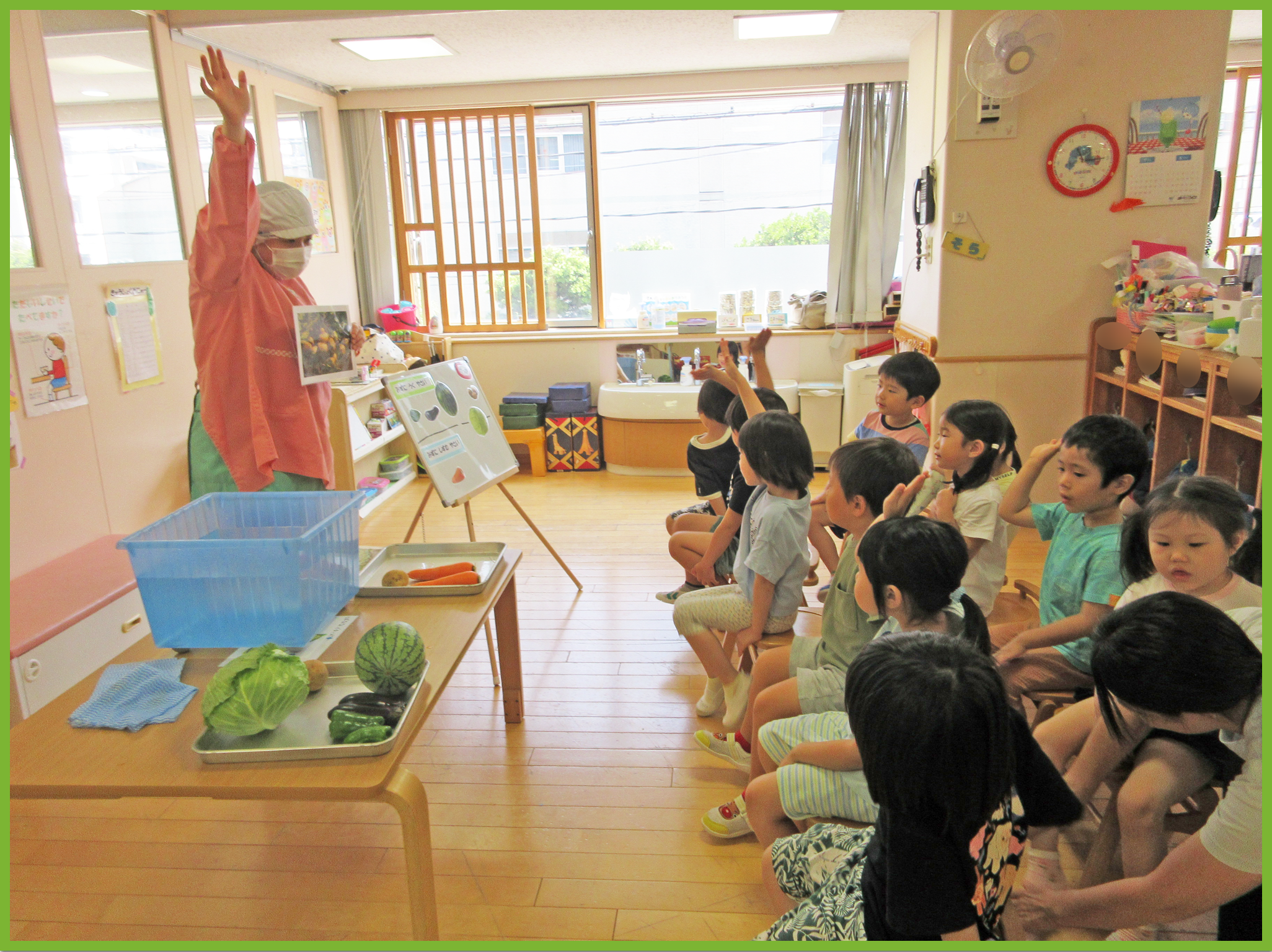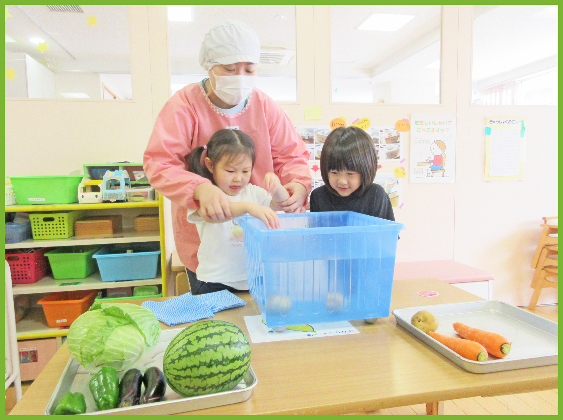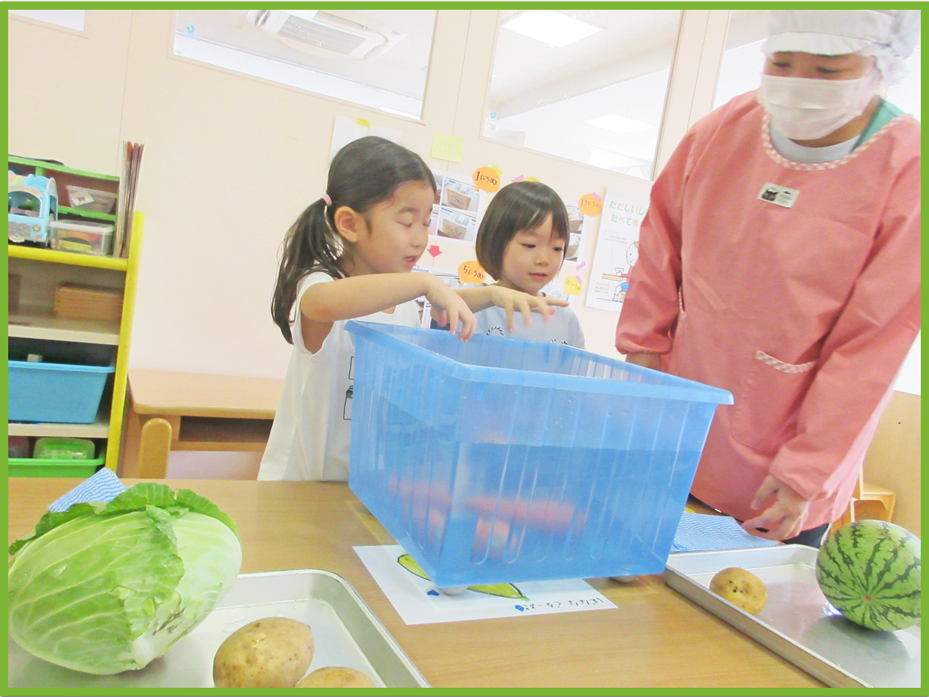 どんな野菜が水に浮くのか沈むのかという予想を立てて実験をしました。キャベツやスイカ等の重い物は沈むと予想し、ナス、ピーマン、人参等の軽い食材は浮くと予想している子が多かったです。実際に水の中に入れてみると重くて沈むと思っていたスイカやキャベツが水に浮き、こどもたちは驚いていました。その後どのような食材が浮いて、どのような食材は沈むのかということを教えてもらうと「他の食材でもやってみたい」「果物だったらどうなるんだろう」と目をキラキラさせていました。