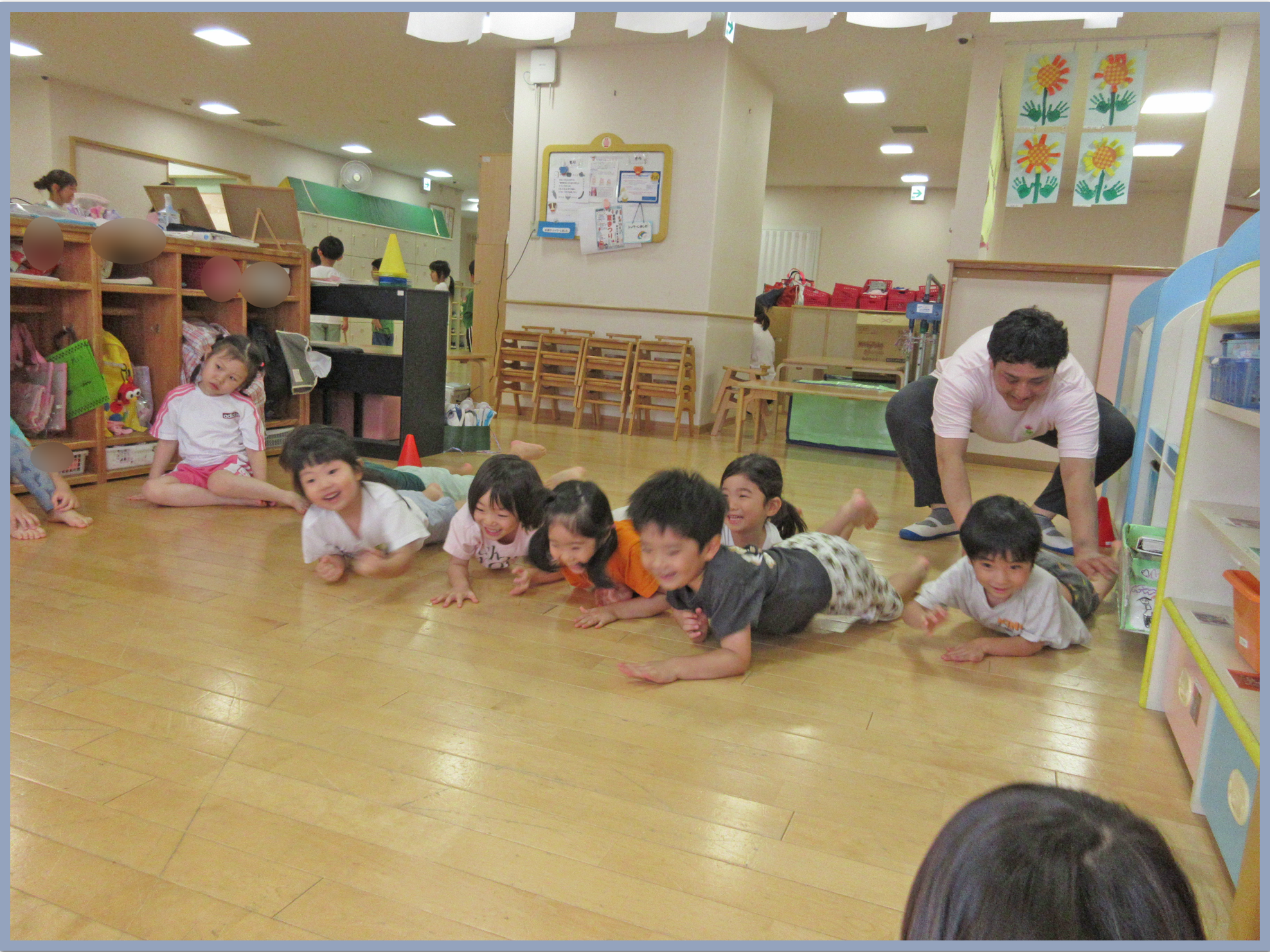 引っ越しゲームをでは、お尻歩きやほふく前進をしながら新しいお家へ引っ越すというルールを決め、保育者に捕まらないよう一生懸命移動していました。途中で捕まってしまったお友だちも最後は全員で引っ越すことができ「やったー」「何とか引っ越せた」と喜んでいました。