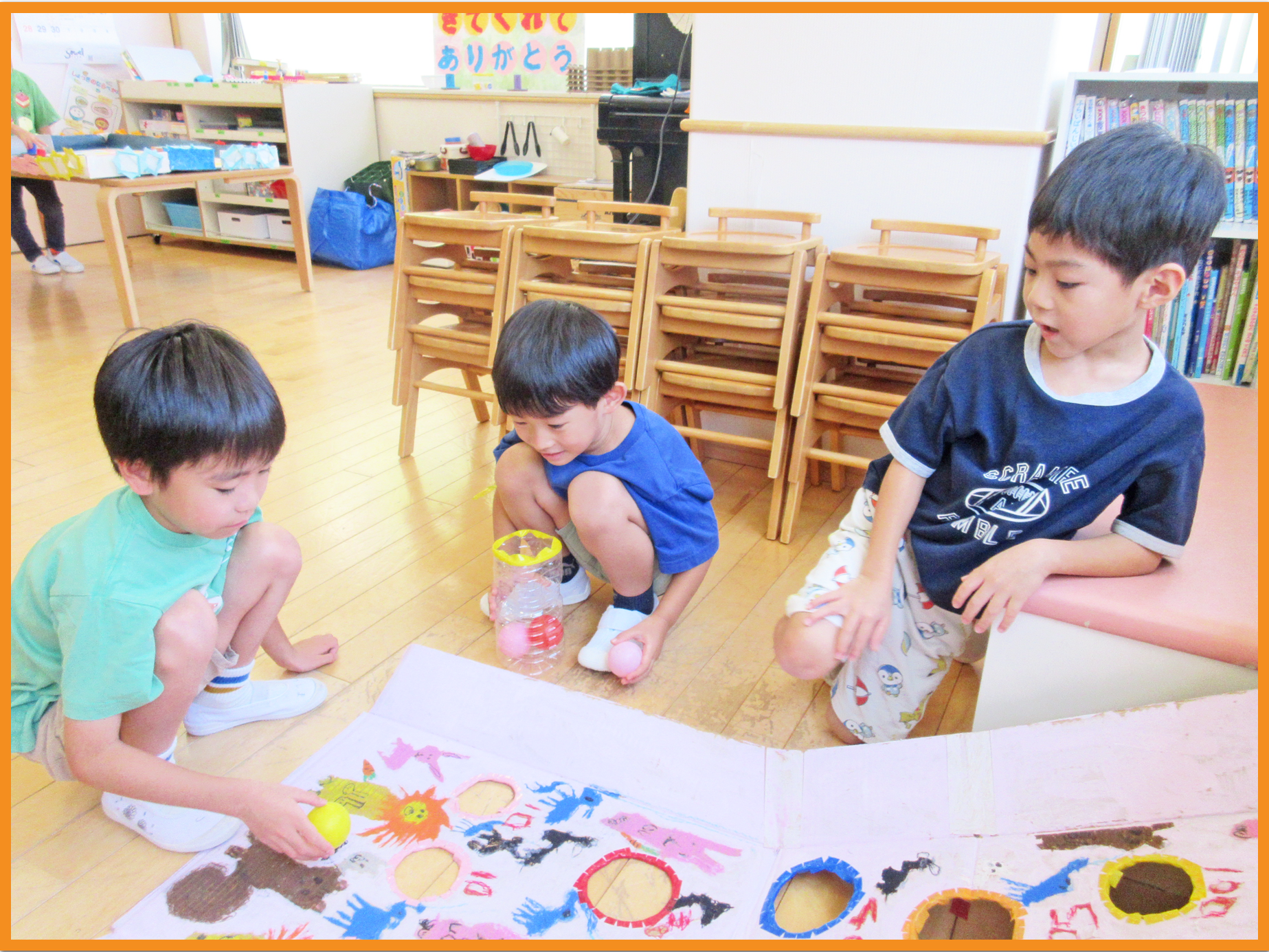 お店屋さんごっこに向けて、クラスで練習した時の様子です。「優しい店員さんがいいよね」「来てくれた子が笑顔になるといいな」と、それぞれなりたい店員さんをイメージしながら練習をしました。各グループで協力し合いながら一つの物を作り上げることができ、準備を通してまた一つお友だちとの絆を深めることができました。