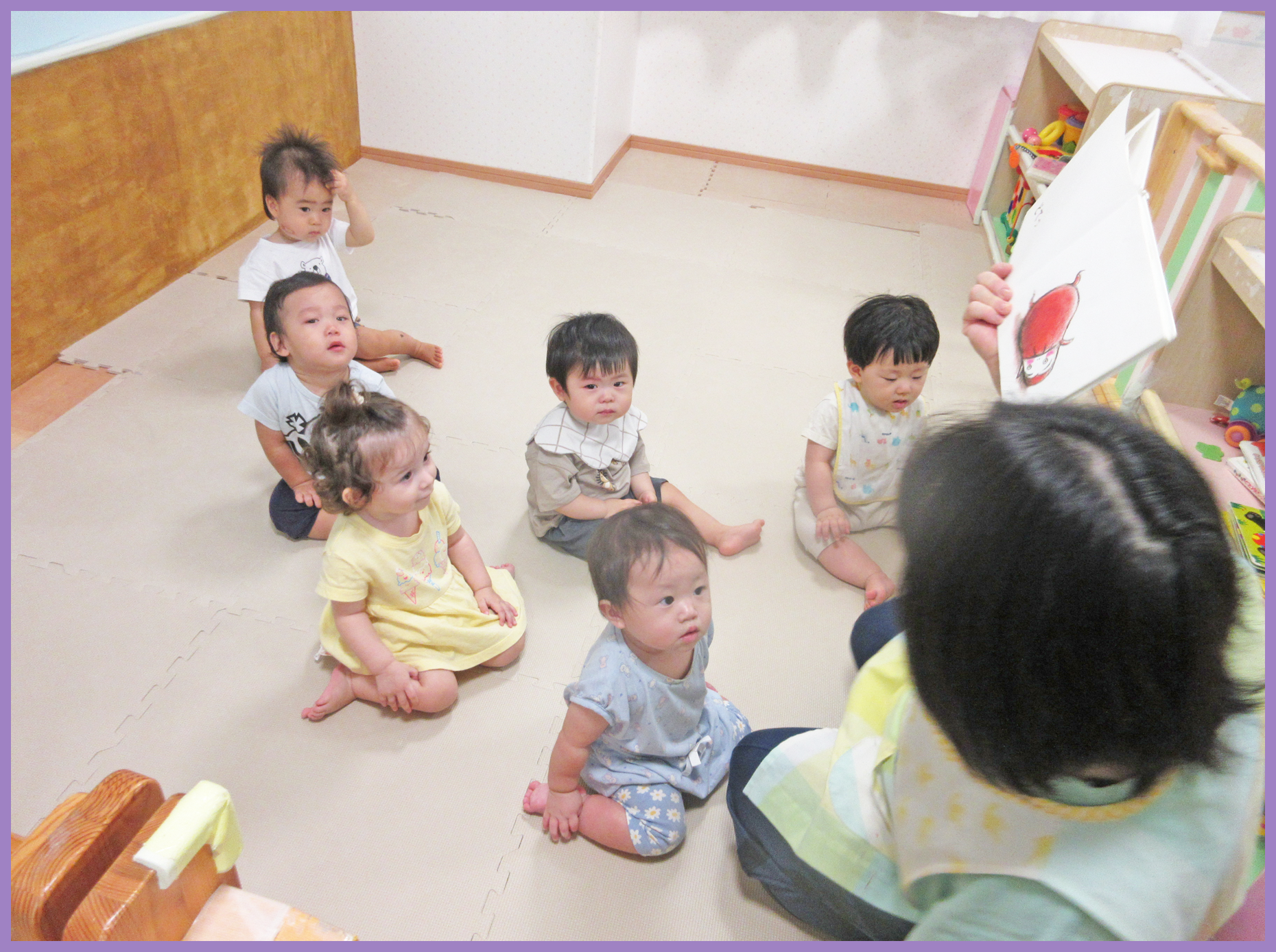 「だるまさんが」の読み聞かせをしながらだるまの動きを真似てみました。保育者が「どてっ」「びろーん」「にこっ」等の声を掛けて絵本の場面に合わせた動作をすると、同じ動きを真似しようと片足を上げたり、手を上に伸ばしたり、一本指を頬に添えて表現を楽しめていました。