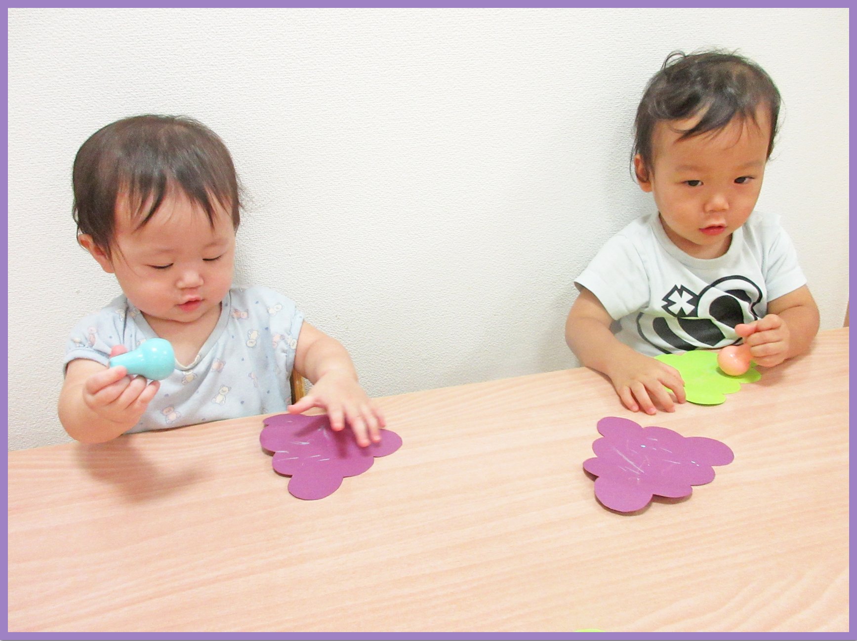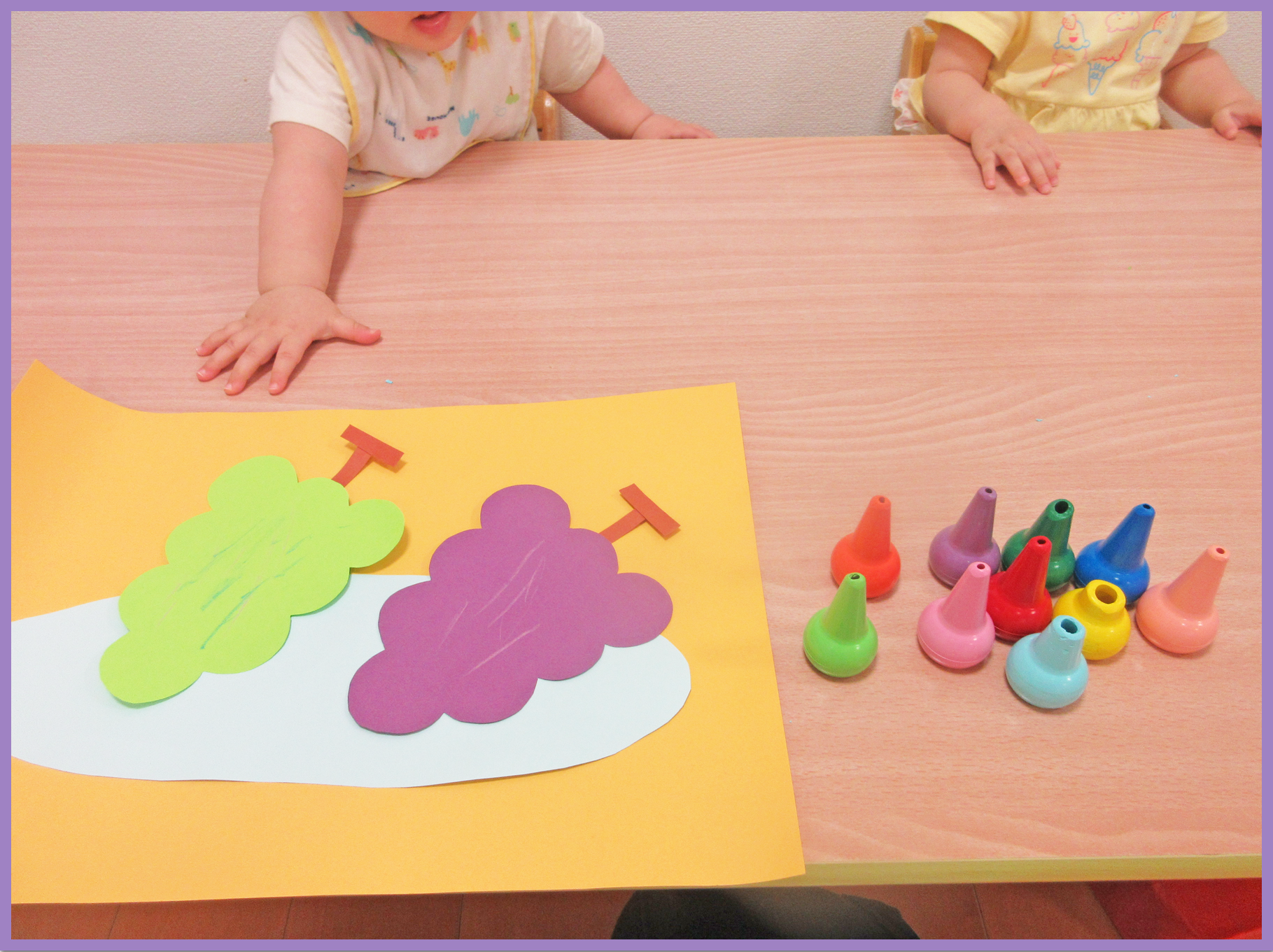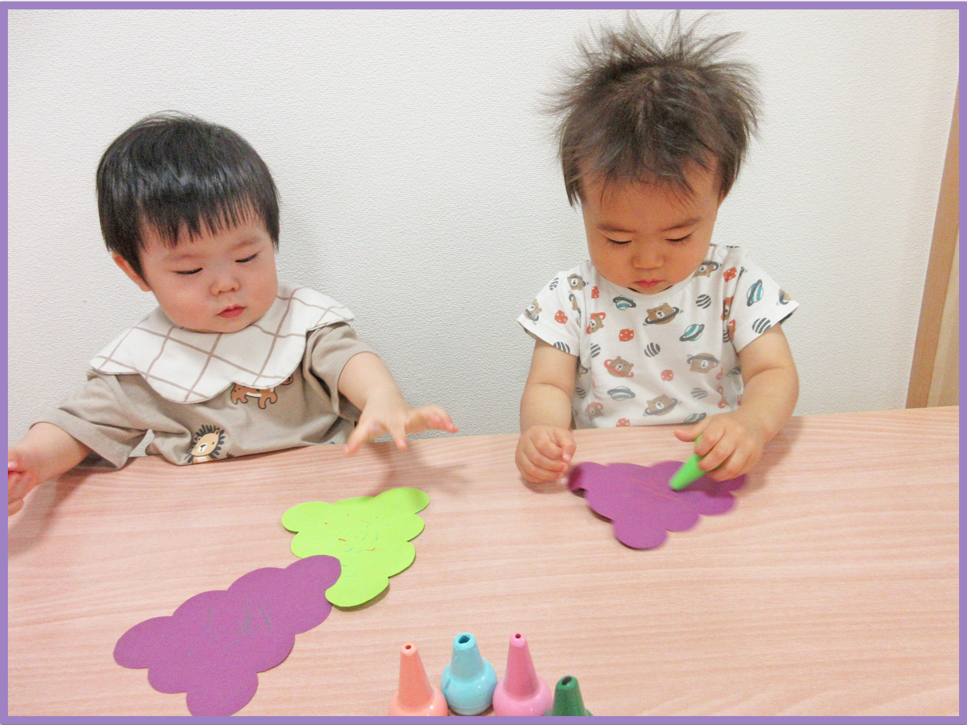 また、初めてクレヨンを使ってぶどうの型紙に製作活動をしました。保育者がクレヨンの箱から「どんな色が好き」「あか」「あお」「きいろ」等の色を伝えながらこどもたちに見せると、クレヨンが登場するたびに「あー」「うー」と声を出し興味を示している姿がみられていました。嬉しそうにクレヨンを選び、ぶどうの紙に「トントン」したり、保育者に手を添えられて自由に線などを描いたりする姿が見られました。