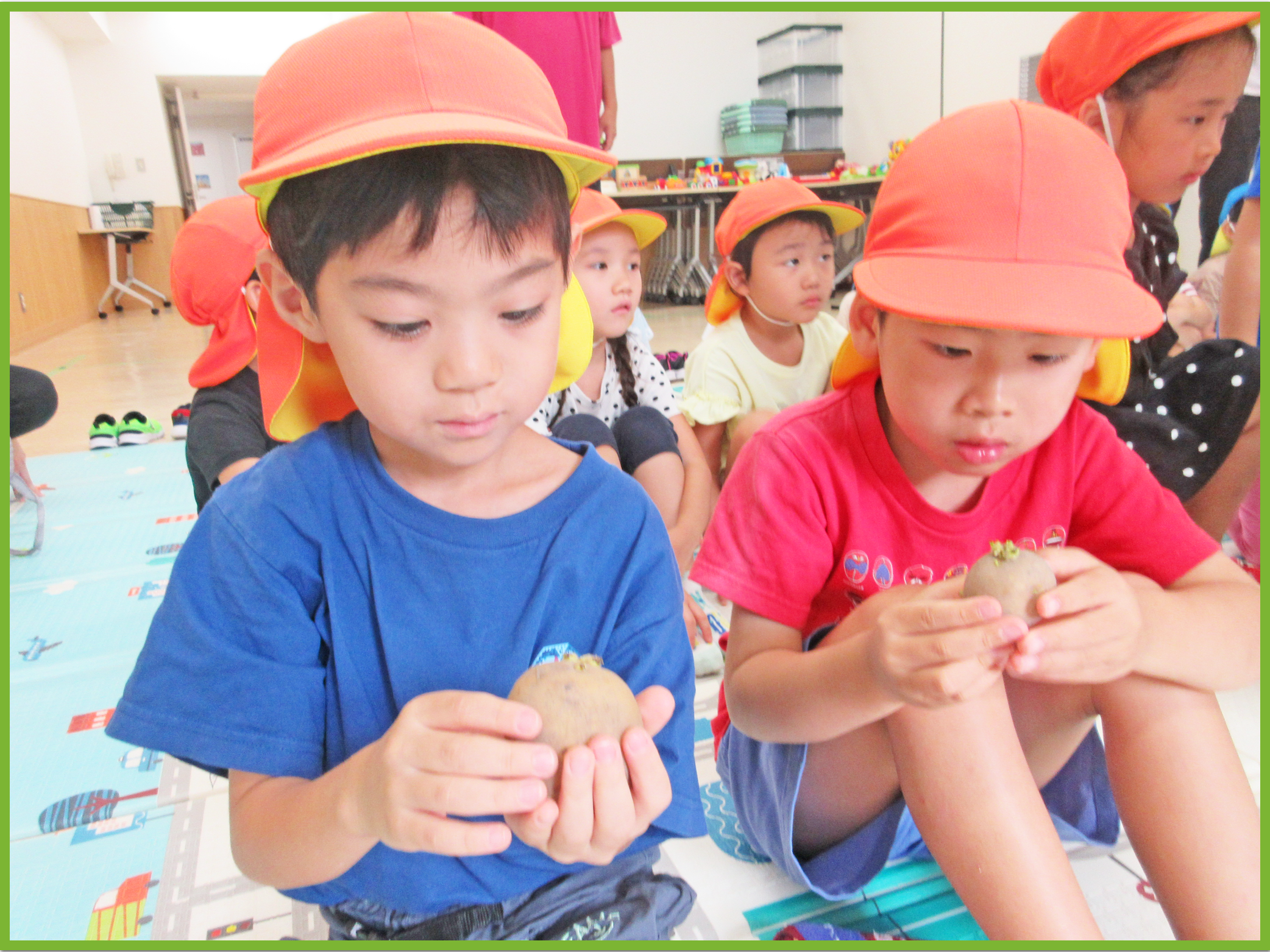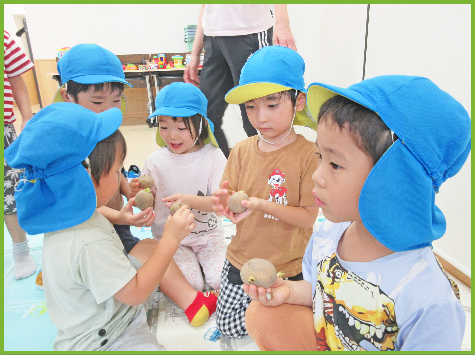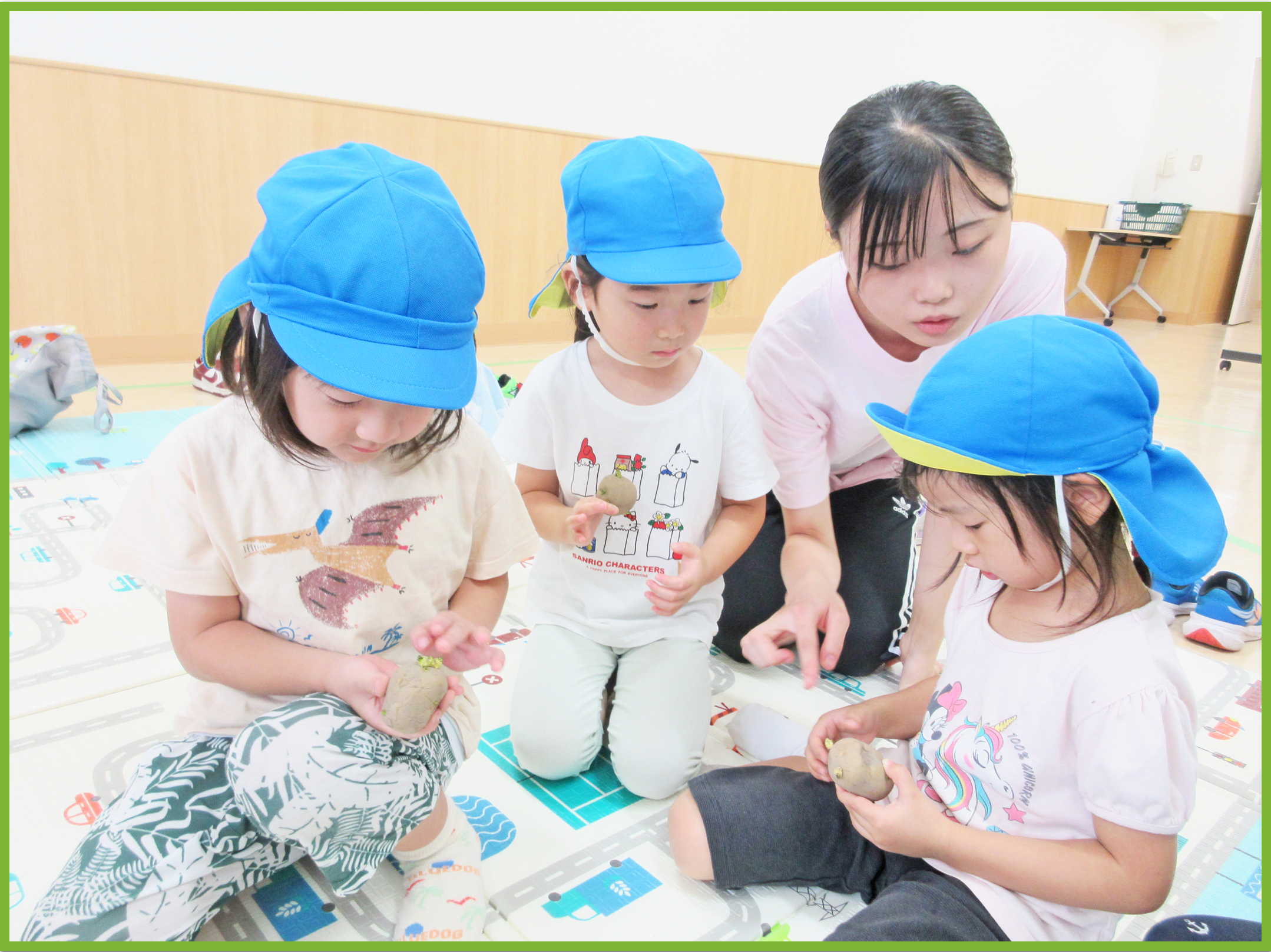 ゆうゆうプラザへジャガイモの種芋を植えに行きました。目が出ているジャガイモを見るのが新鮮だったようで、「ここから茎が生えてくるんだね」「初めて見た」と興味津々な様子で話を聞いていました。