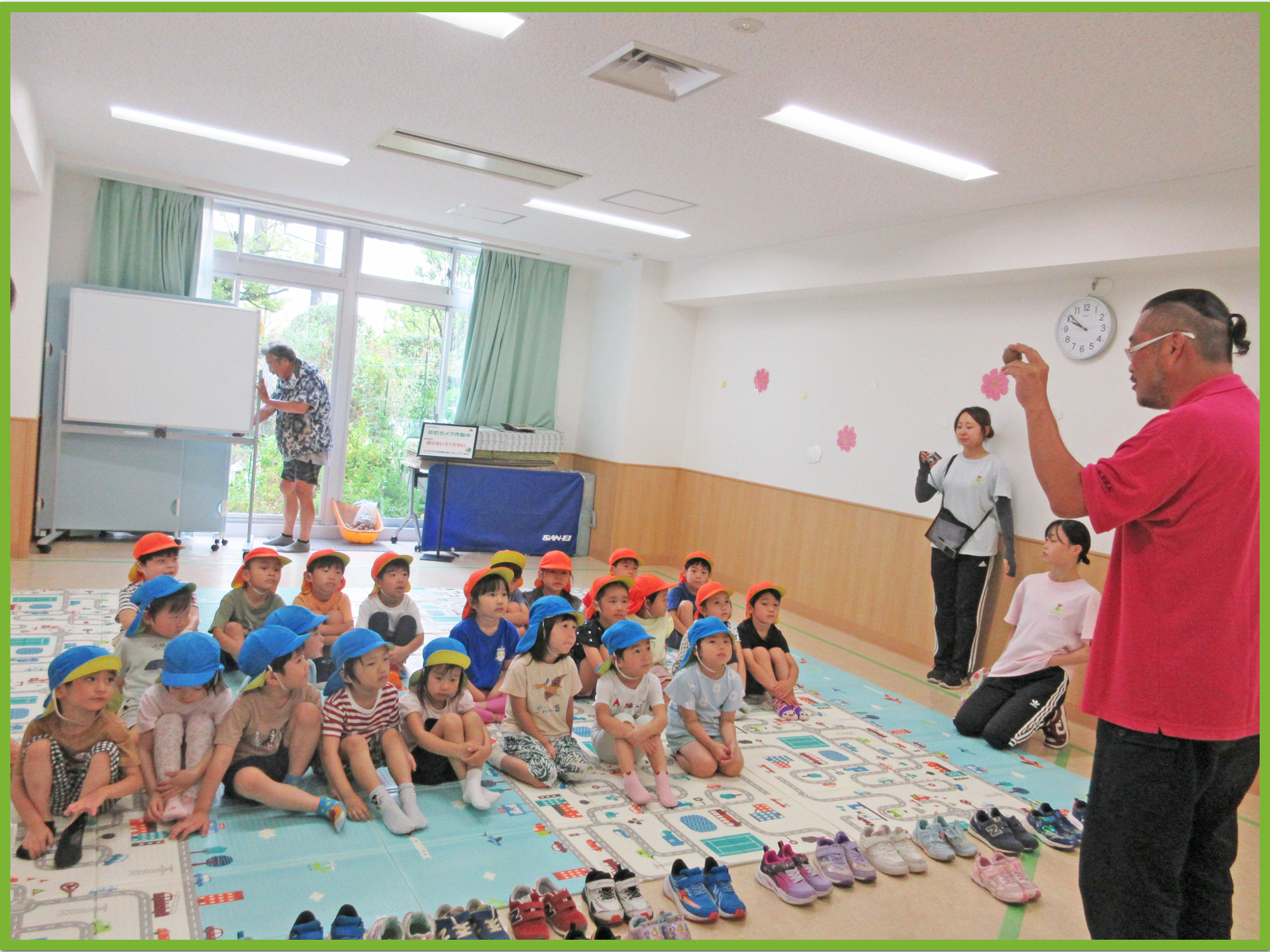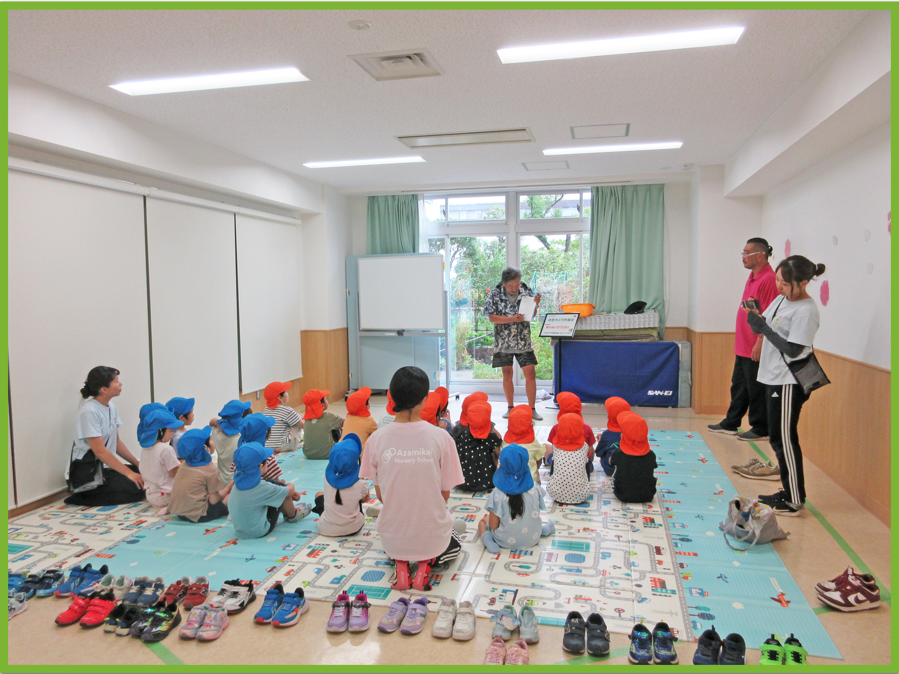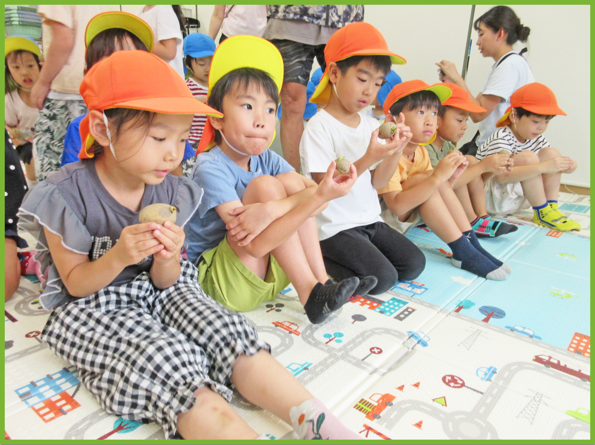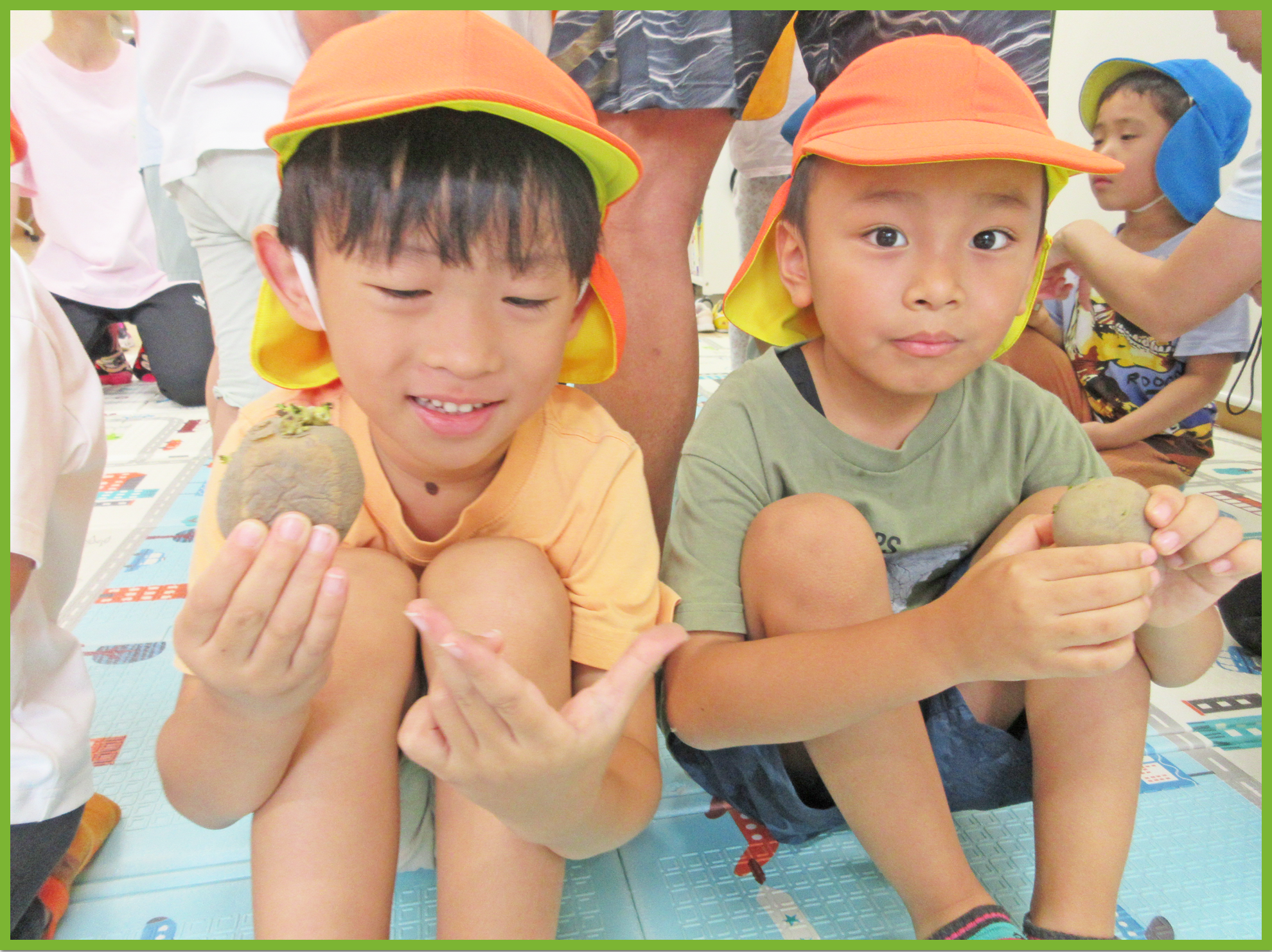 ゆうゆうプラザへジャガイモの種芋を植えに行きました。目が出ているジャガイモを見るのが新鮮だったようで、「ここから茎が生えてくるんだね」「初めて見た」と興味津々な様子で話を聞いていました。