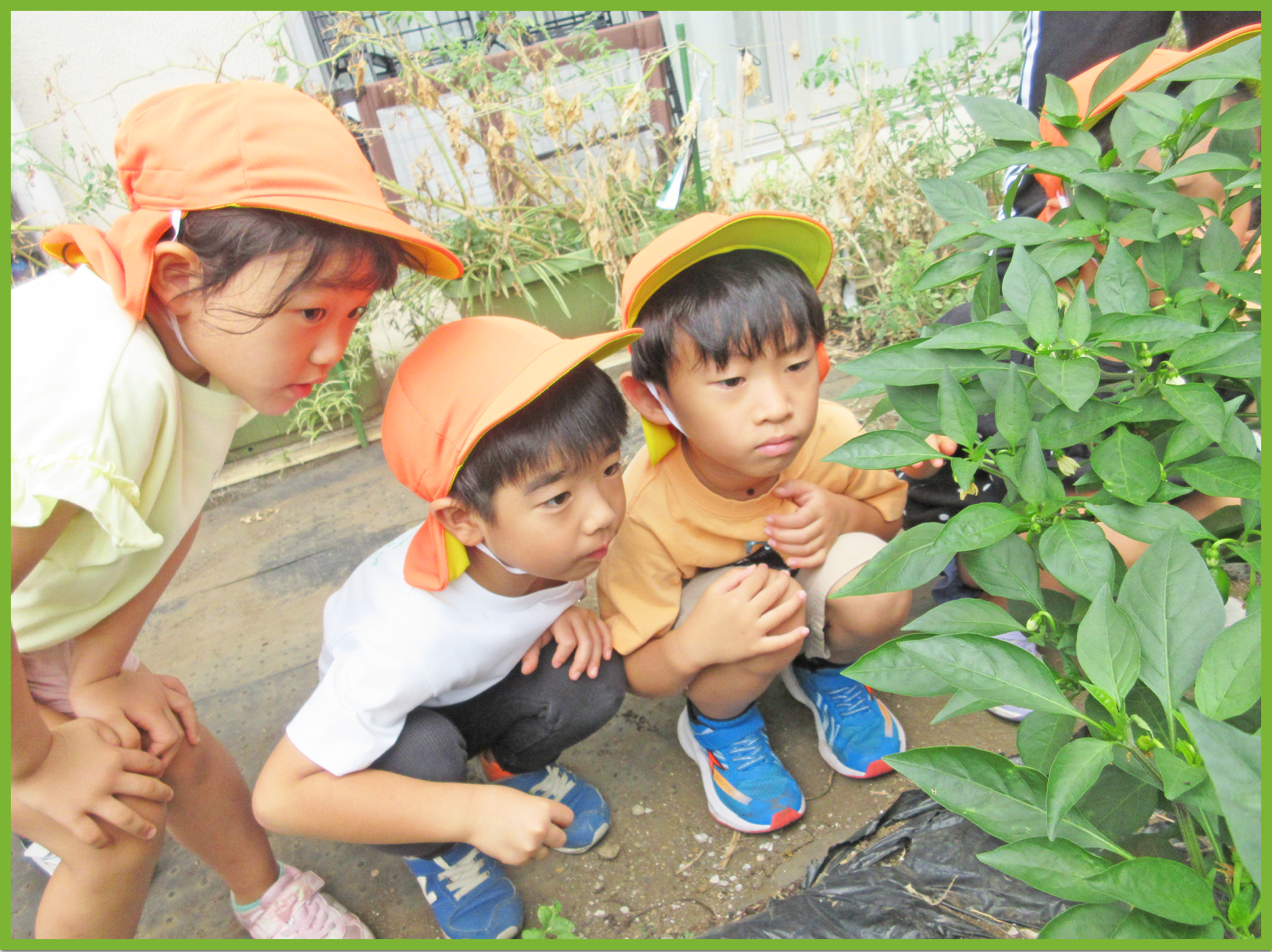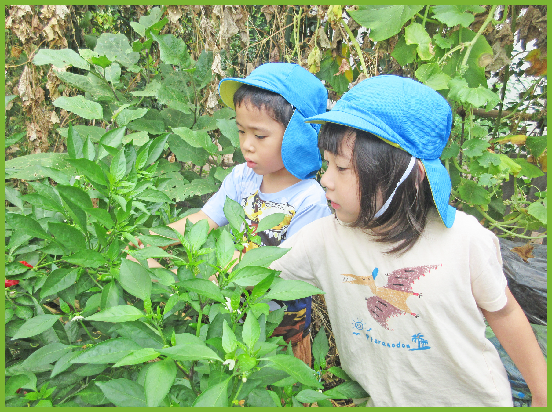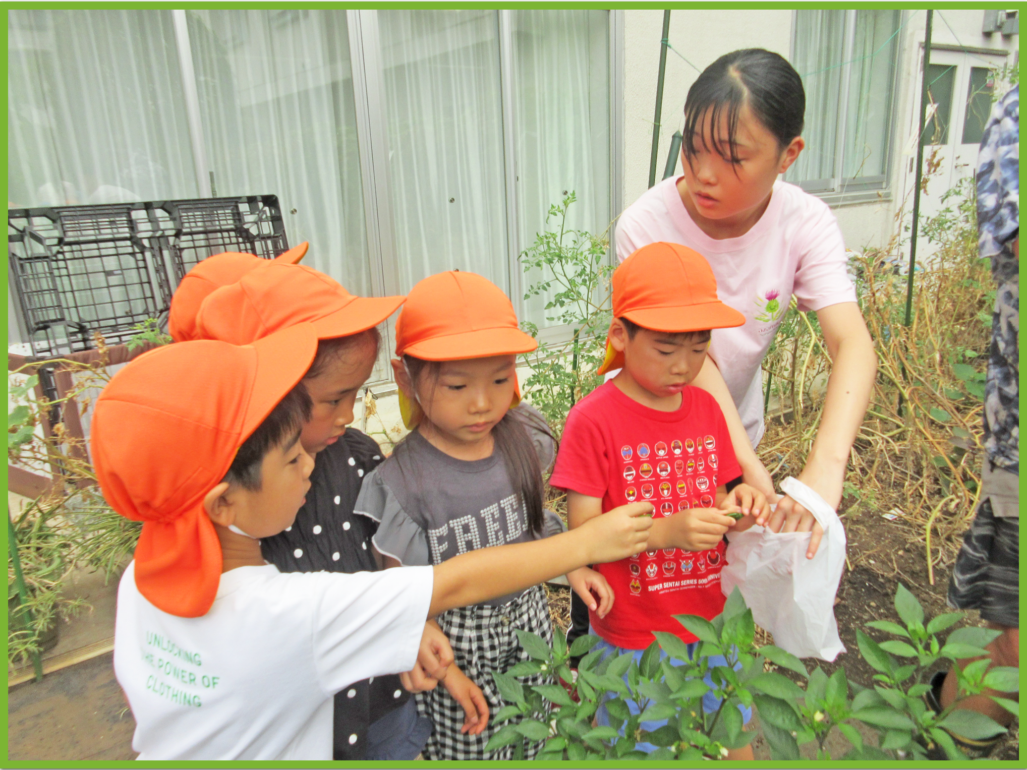 優しく土をかき分けると、「大きくなるんだよ」「美味しいジャガイモになるんだよ」と種芋を植えていました。植えた後は、ルッコラやオクラ、獅子唐の収穫もさせてもらいました。次はジャガイモの芽が出た頃に、また観察をしに行く予定です。