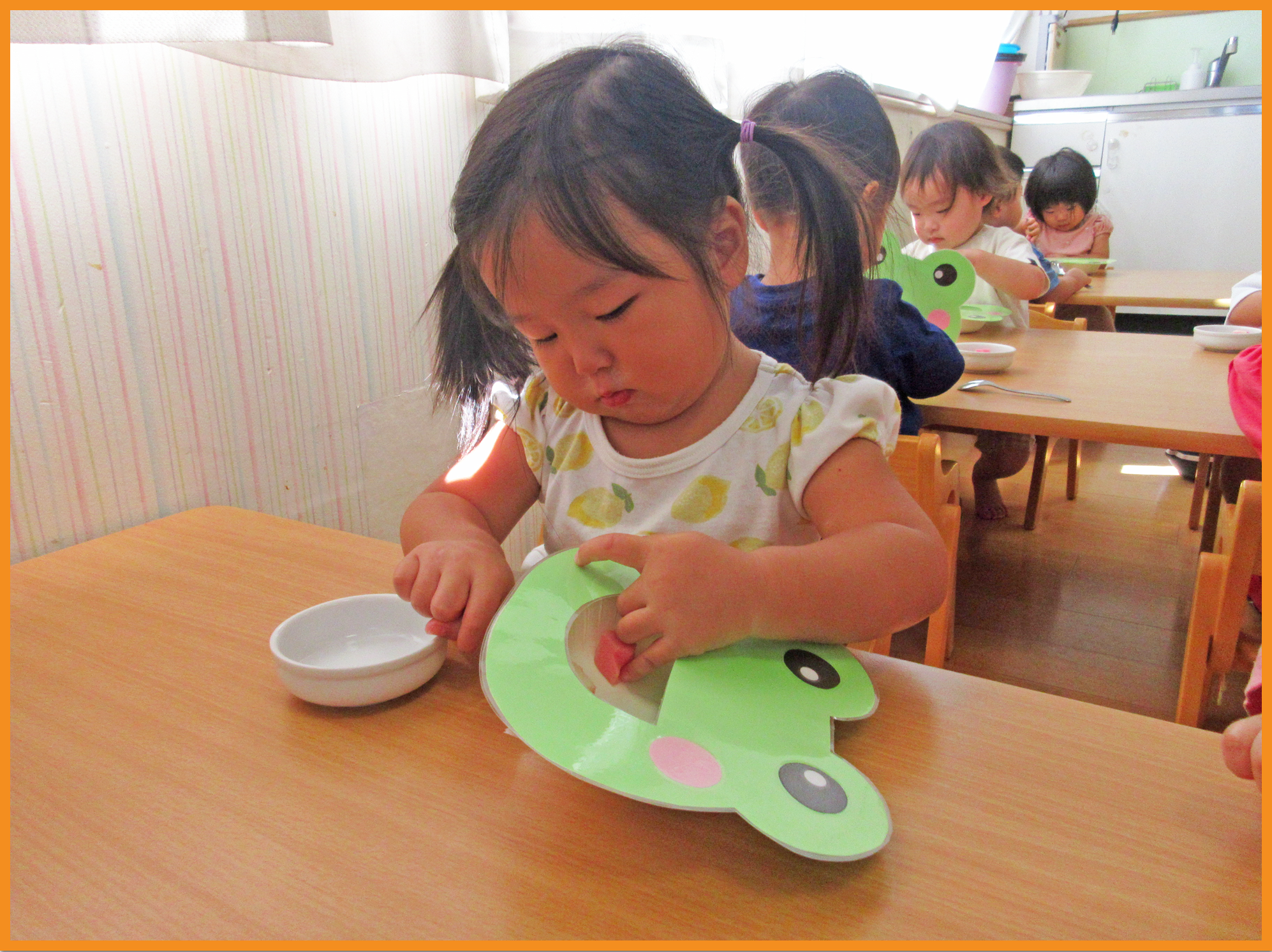 まだ上手持ちをしている子がほとんどですが、三指持ちができる子も数名います。それぞれの持ち方で小さく切ったスポンジをカエルの器(口)へ運び入れていきました。