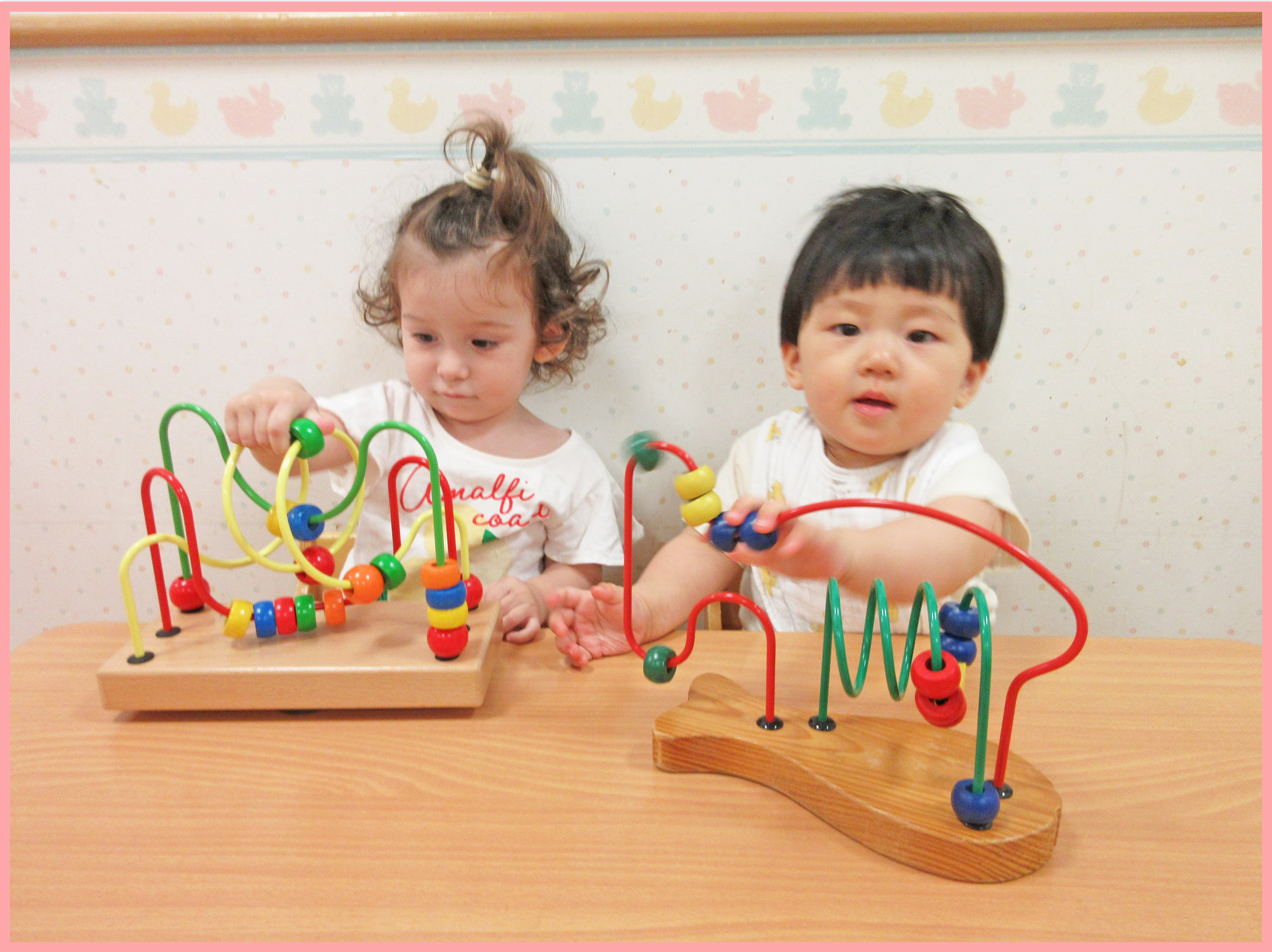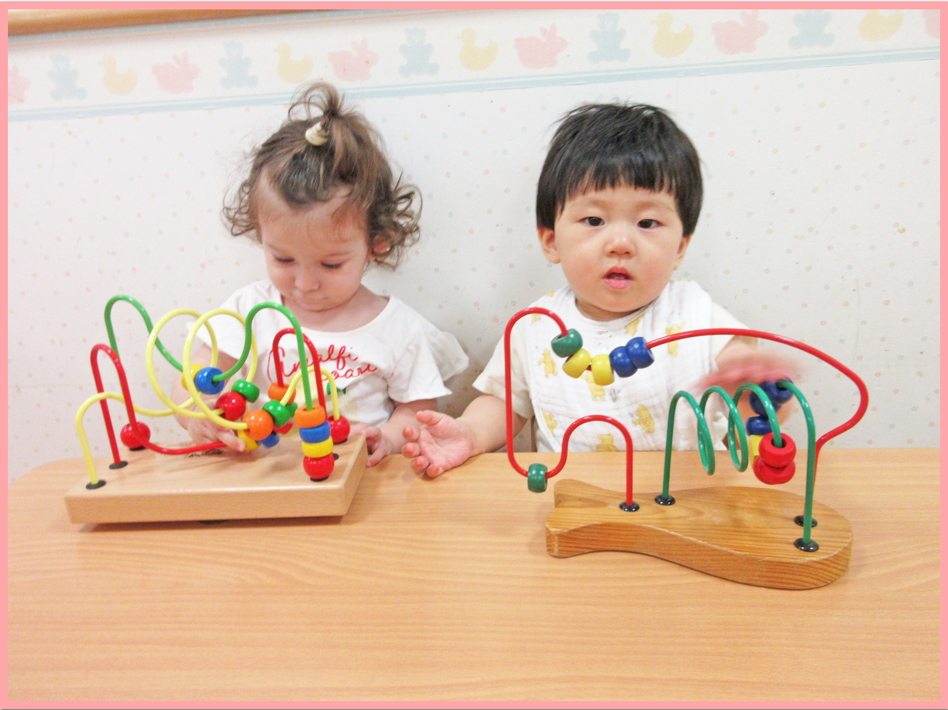 ホースやチェーンなどを落として入れる手作り玩具やルーピングで手指を使う遊びを楽しみました。2人ずつ順番に椅子に座って保育者が遊び方を見せて誘うと、こどもたちは興味津々にその様子を見ながら、真似をしていました。最初は、ゆっくりつかんで入れ物の中に落として入れていましたが、慣れてくると、コツをつかみ上手にホースやチェーンを何度も出し入れしたり、ルーピングのピーズを手指でつまんで動かしたりしながら楽しそうに遊んでいました。
