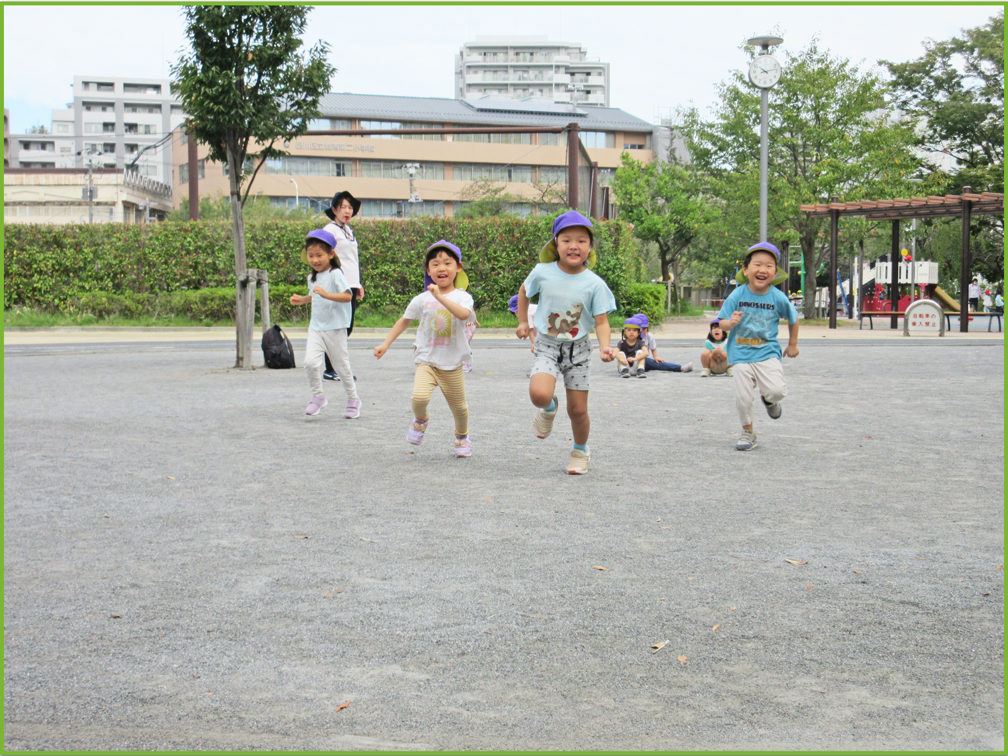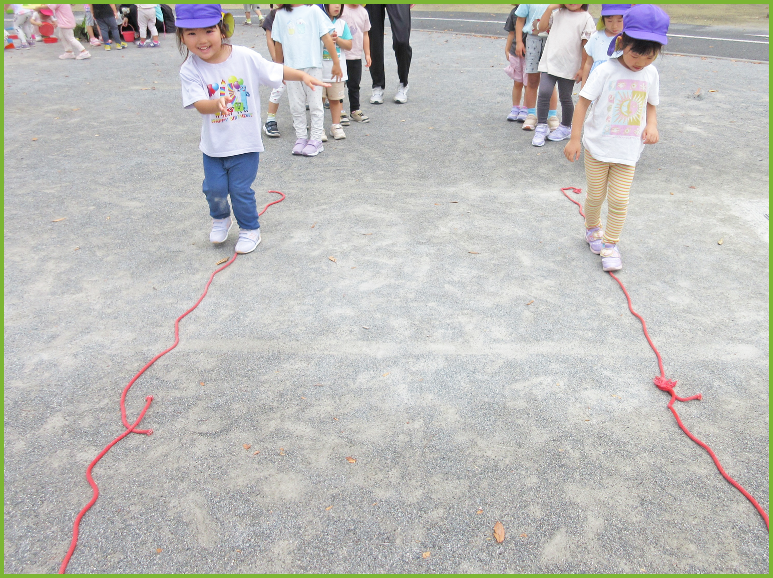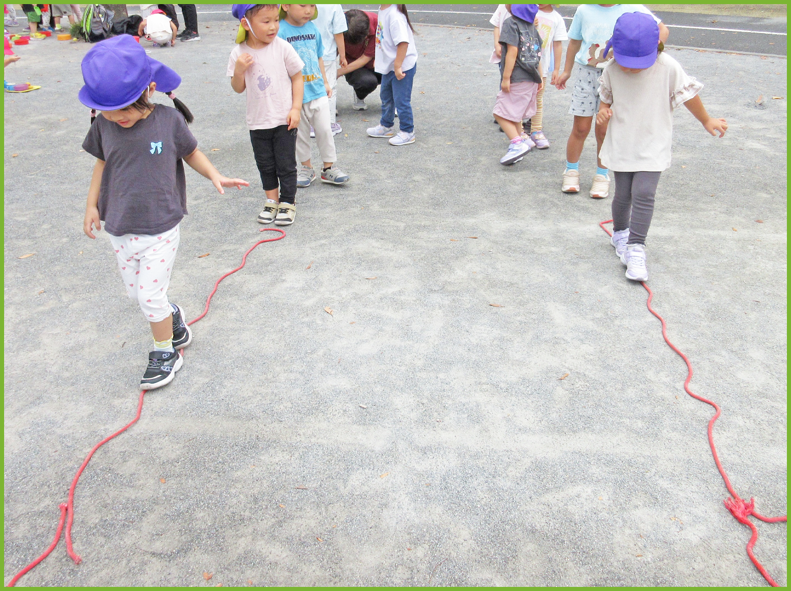 運動会に向けて、かけっこと綱渡りの練習をしました。こどもたちは「ママとパパが来る」「お姉ちゃん、おじいちゃんおばあちゃんが来る」など喜んで話をしていました。かけっこの練習も楽しみな気持ちを持ったまま、名前を呼ばれると大きな声で返事をし、ゴールまで力いっぱい走り切っていました。綱渡りは親子競技で行います。「綱から落ちるとワニになった保育者に食べられちゃうよ」と伝えると落ちないように上手に渡っていました。