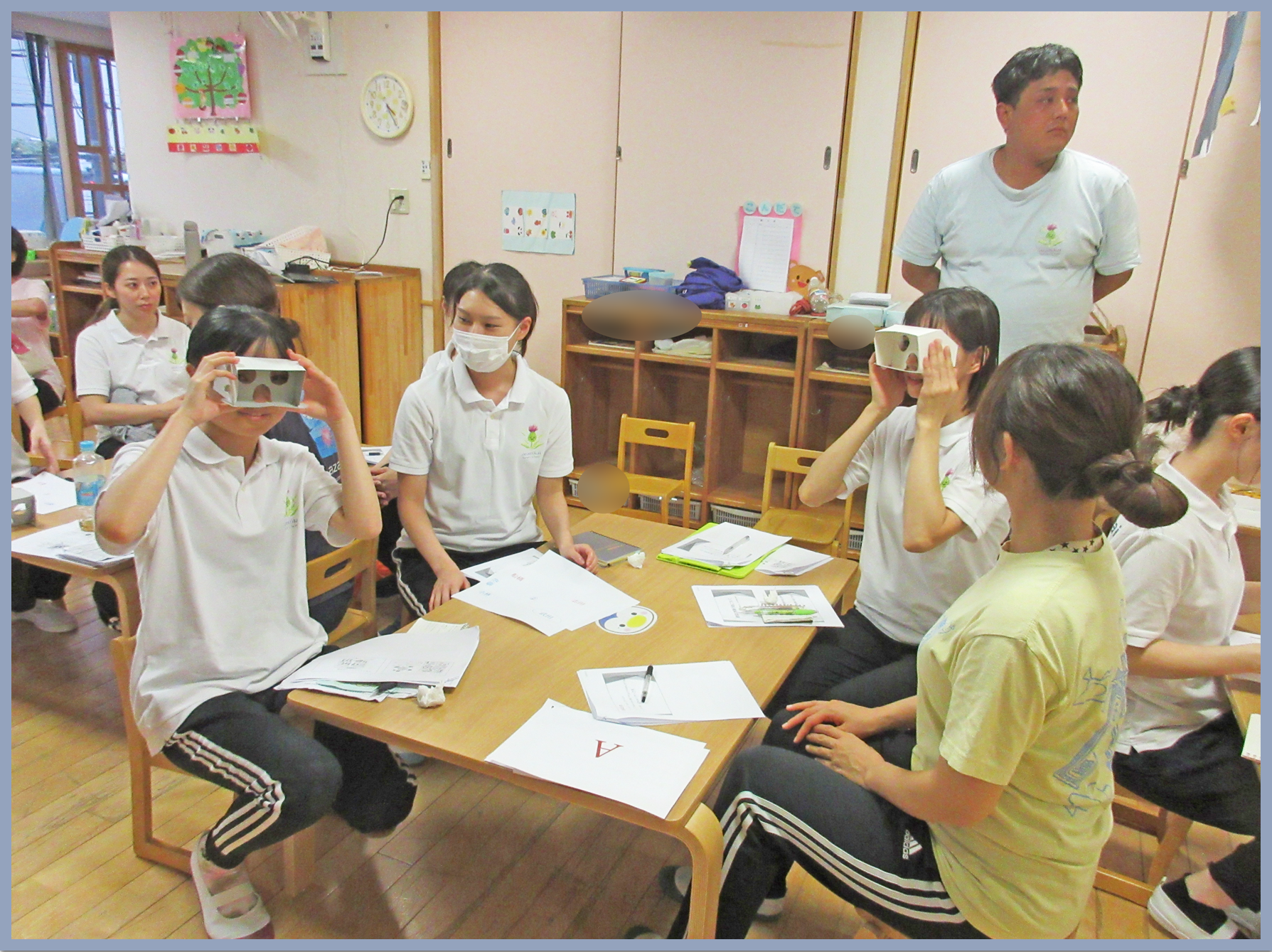 こどもの視点研修では、こどもから見た大きさ、重さ、見え方、速さなど、実物大の物を用意したり、こどもの歩幅を体験したり、こども目線でのことを実際にやってみました。