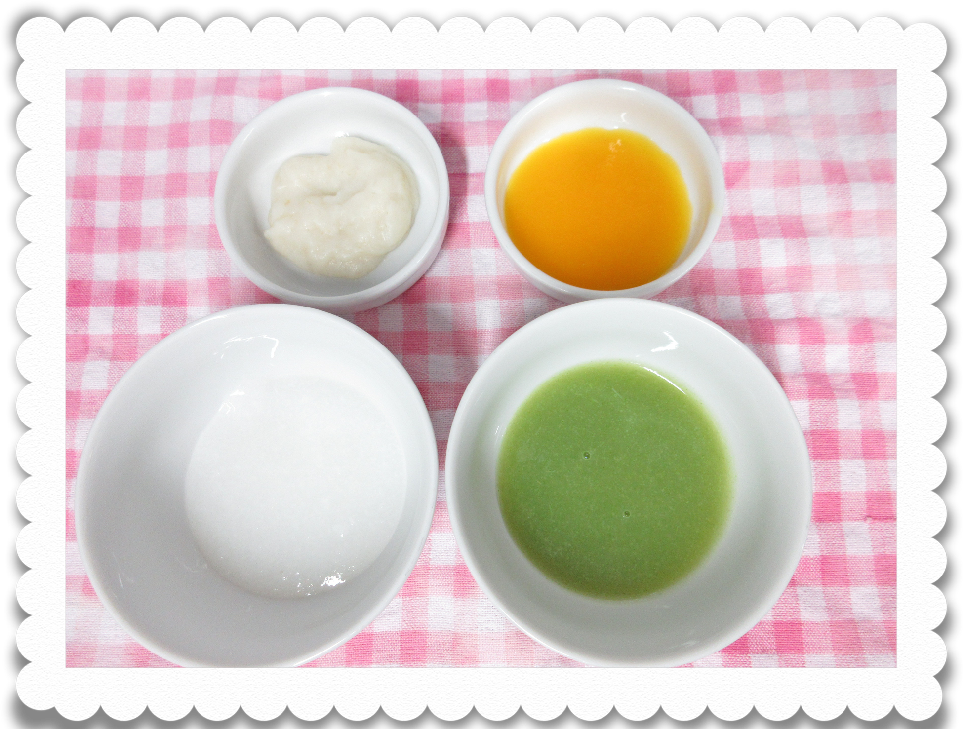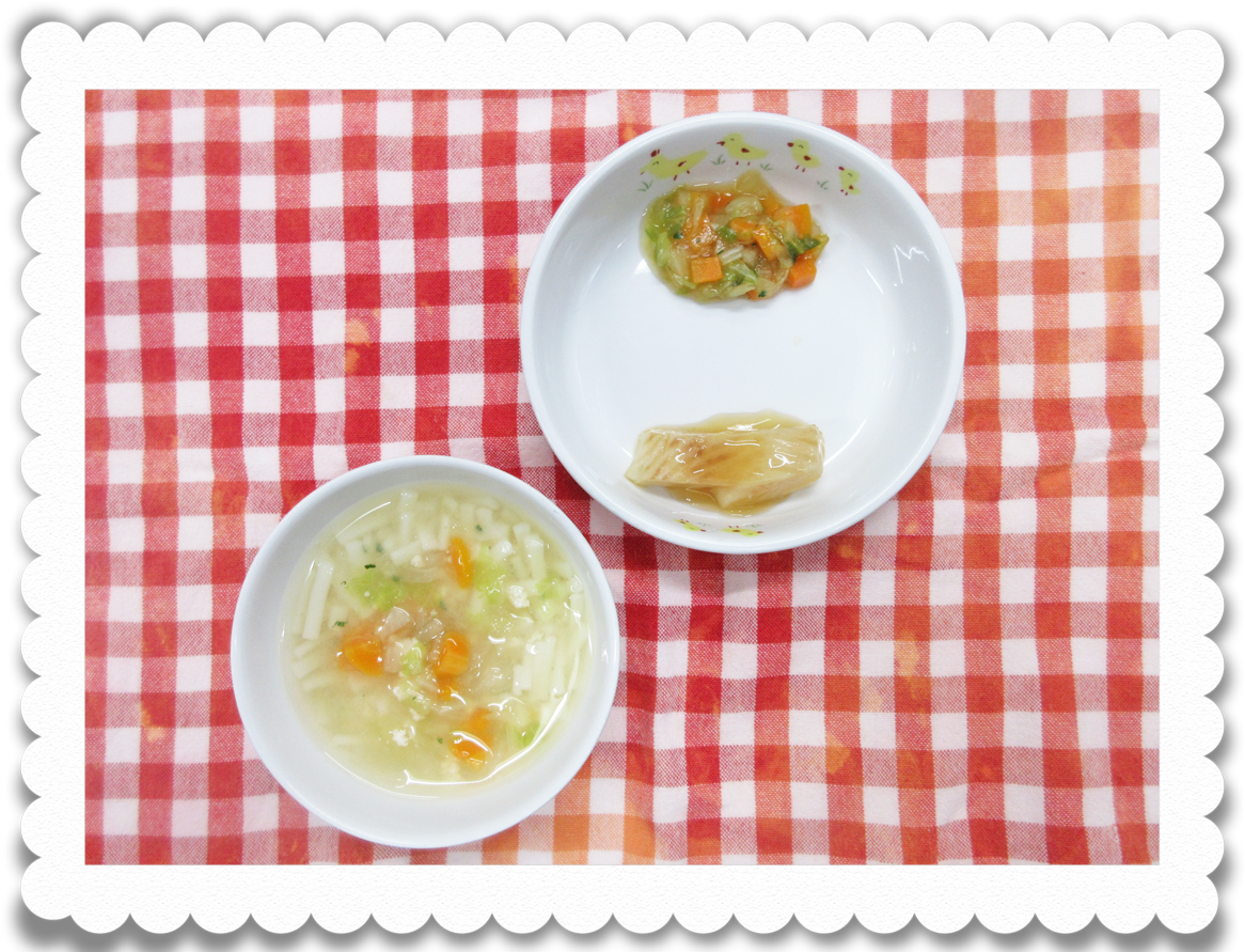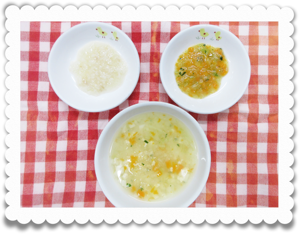 午前食:10倍粥、白身魚のペースト、玉葱と人参のうらごし、野菜スープ