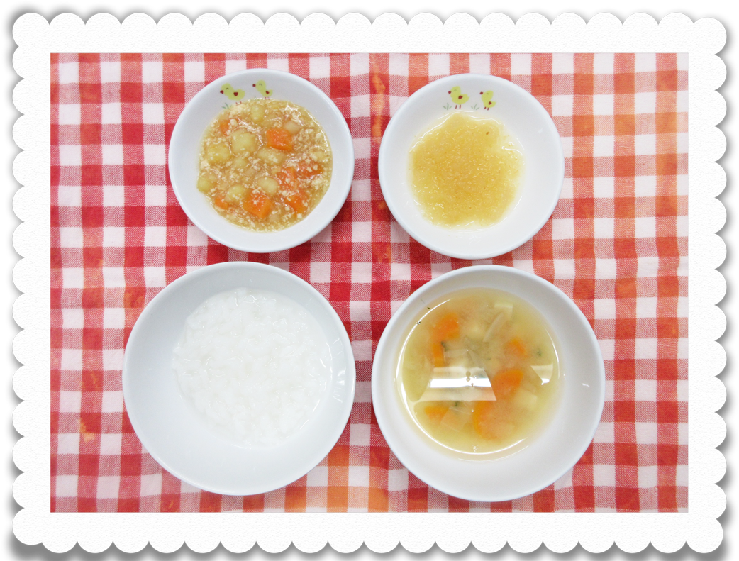 午後食: 全粥、じゃがいものそぼろ煮、みそ汁、果物