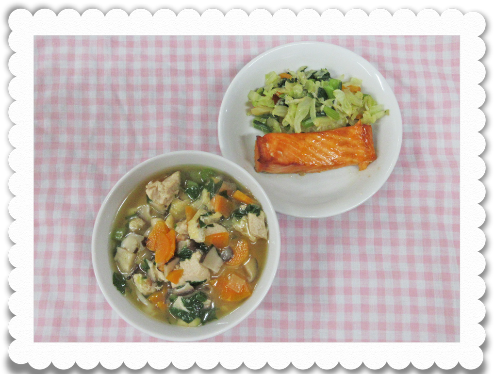 午前食: みそうどん、鮭の照焼き、小松菜ソテー