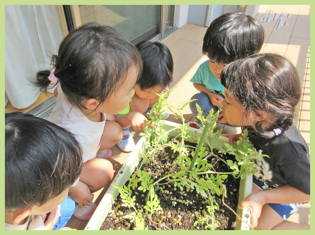 苗の一部分が枯れてしまった時期もありましたが、こどもたちが一生懸命「大きくなぁれ!」と声をかけながら水やりを頑張ってくれていたおかげで、無事にスイカができました。