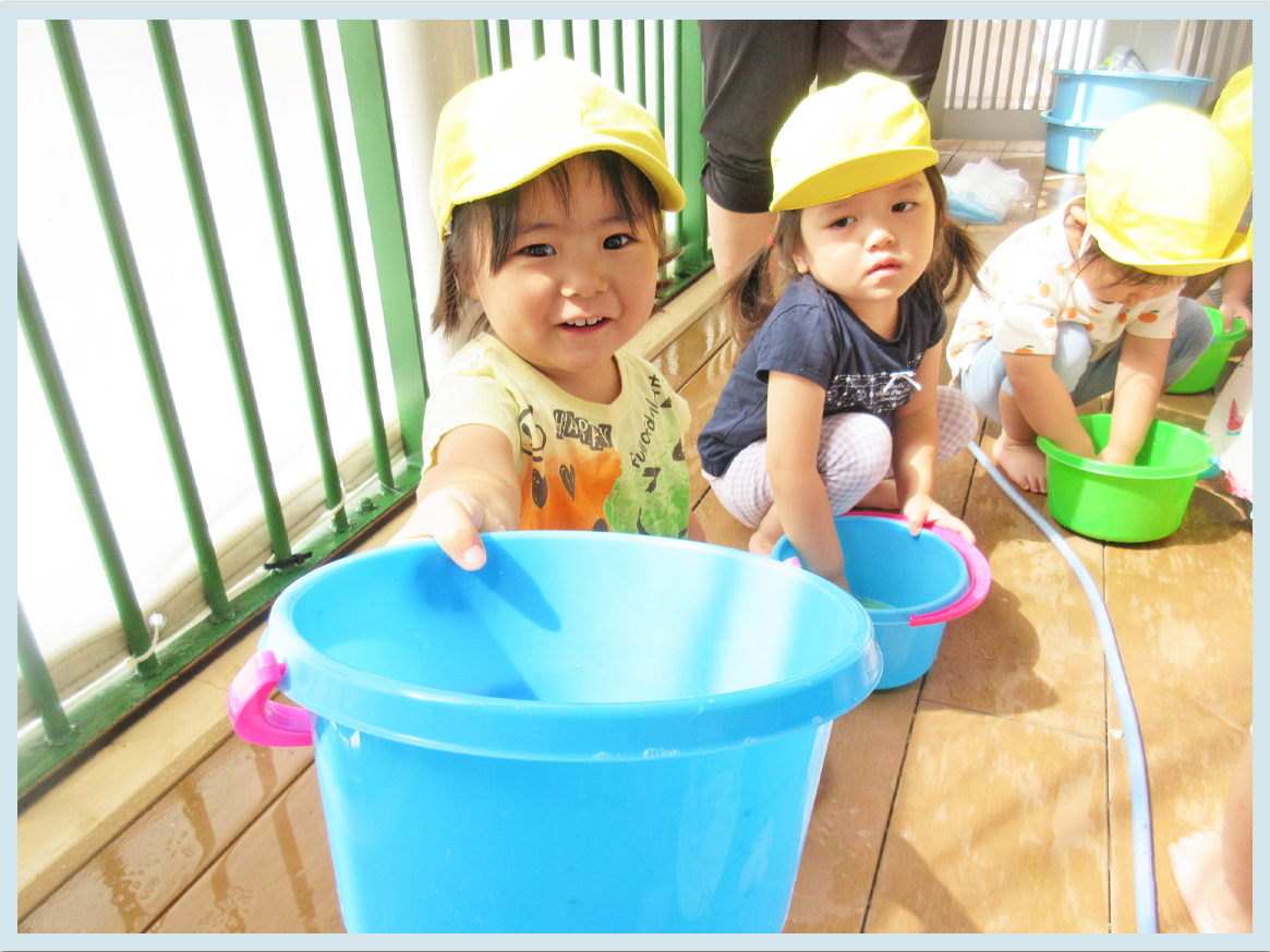 今日はテラスで泡色水遊びをしました。小さな石鹸と色水を入れてかき混ぜると、色付きのモコモコの泡が完成し、「すごーい」「かわいい」と嬉しそうな姿がみられました。