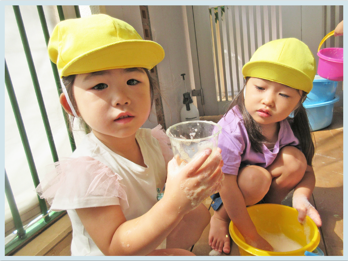 コップに入った泡を見て「これジュースみたいだね」「どんな味かな?」と興味津々なこどもたちでした。