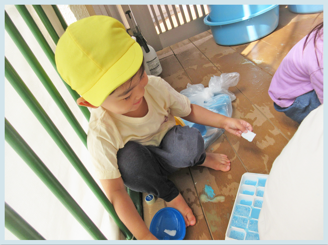 モコモコの泡を友だちと分け合いっこをして混ぜ、スプーンで掬い製氷皿に移して「楽しいね」「氷みたいね」と話す姿がみられました。