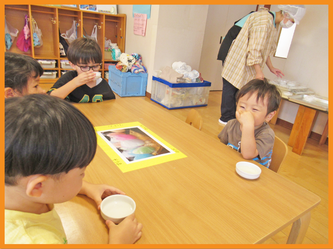 最初の野菜出汁では「なんか土みたいな匂い」「あんまりいい匂いじゃないね」と話すこどもたち。一口ずつ飲んでいくと「なんか飲んだことがあるような」「好きな味じゃない」と話す姿が見られました。次のかつお出汁では「あー。この匂い、いつものみそ汁の匂い」「この匂いお家でも嗅いだことがある」と話し、出汁もほとんど飲み干す姿がありました。最後の昆布出汁は「この匂いは嫌だな」「海みたいな匂いもする」と話すこどもたちでした。