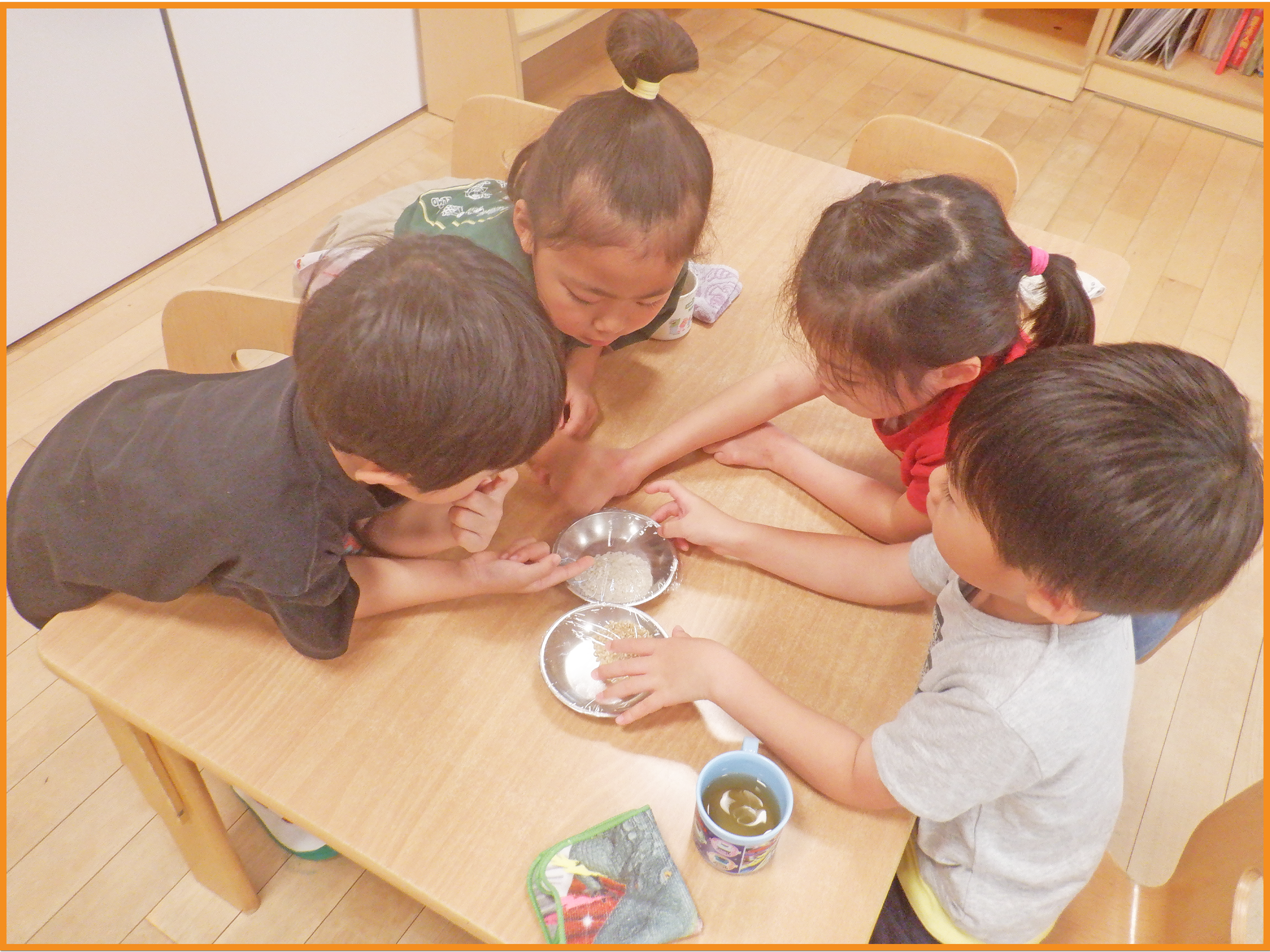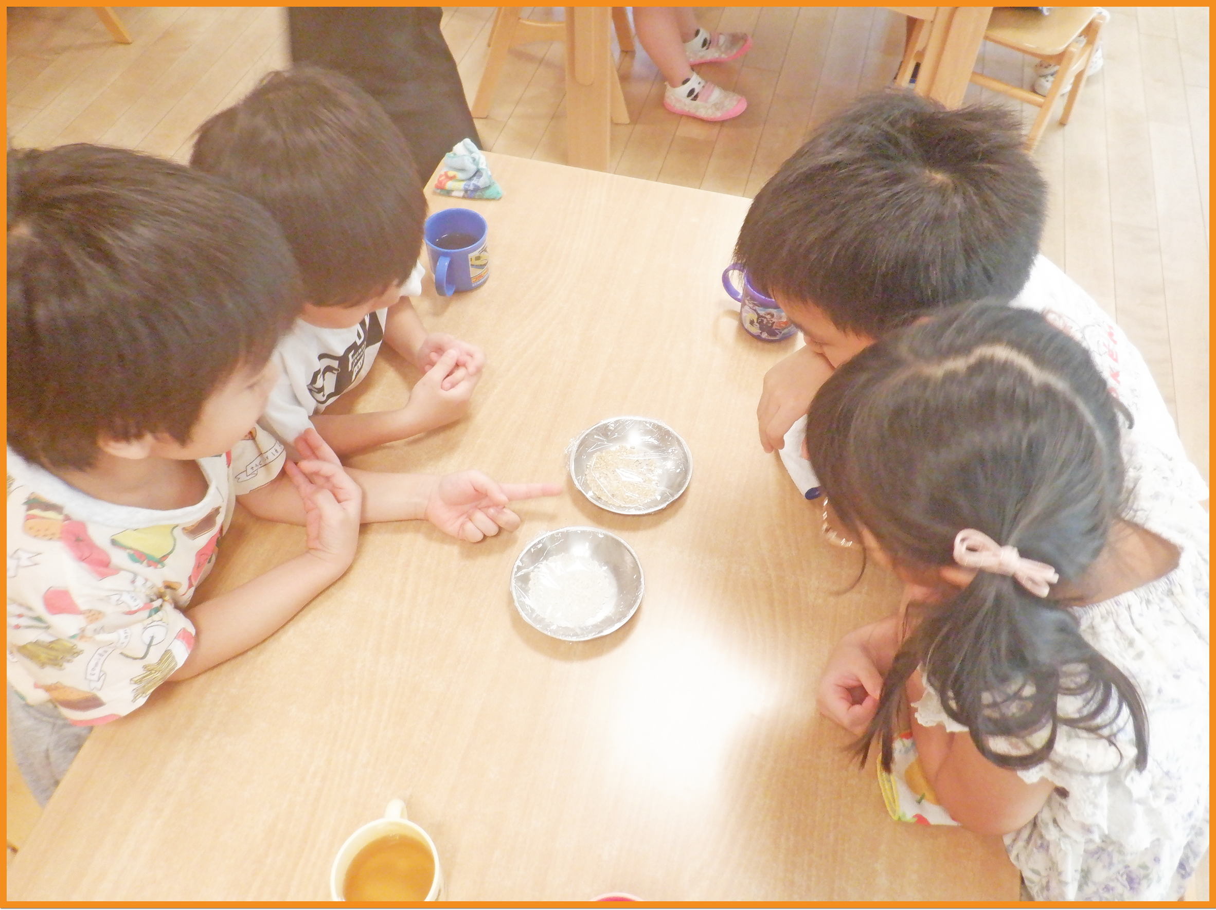 米を見比べ「玄米の方が少し大きいね」「思ったよりも茶色い」と友だち同士で気付きを話し合うこども達でした。