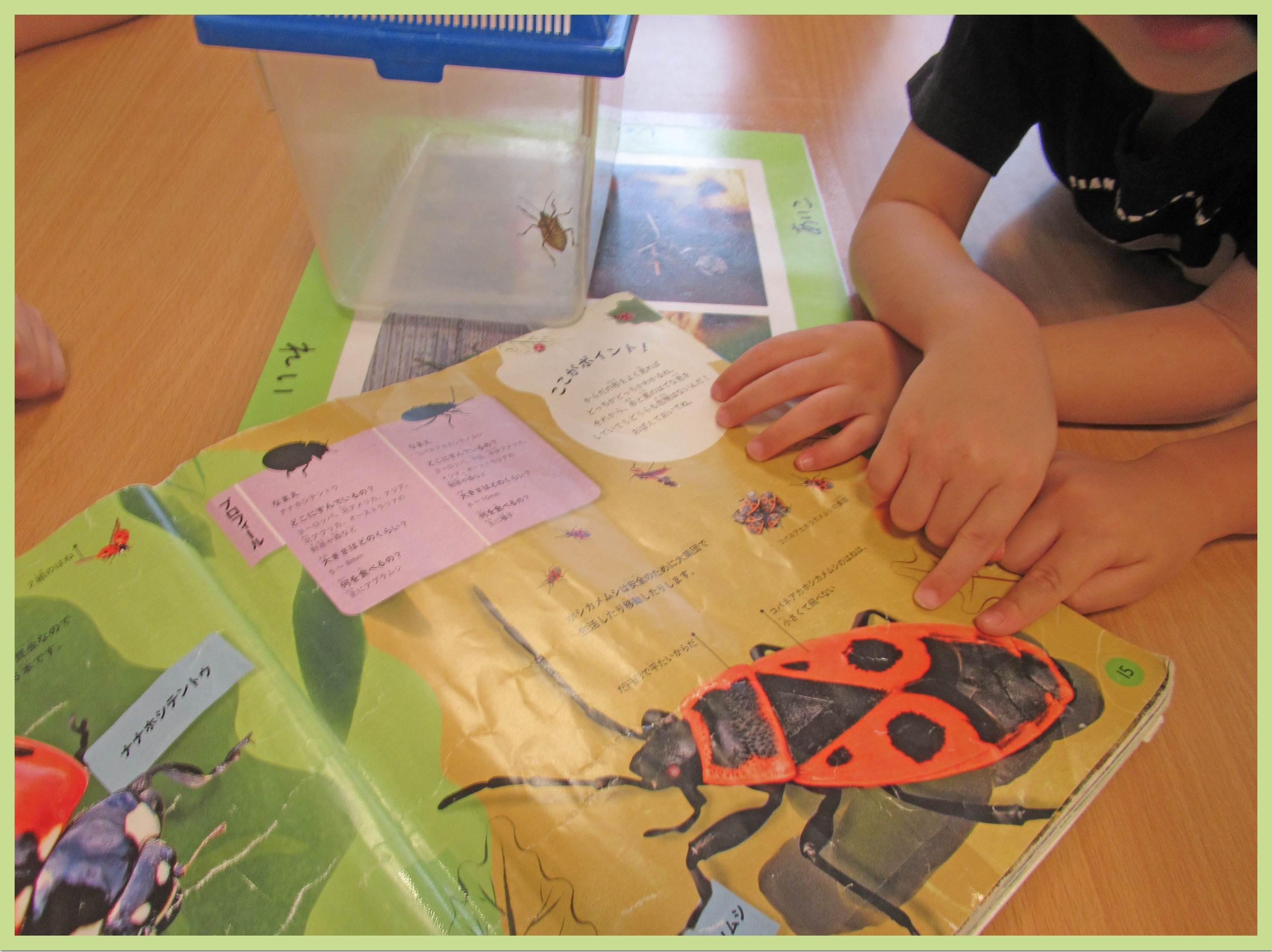 図鑑を広げ「何食べるのかな」「どこに住んでいるのかな」と友達と相談しながら、じっくり観察していました。