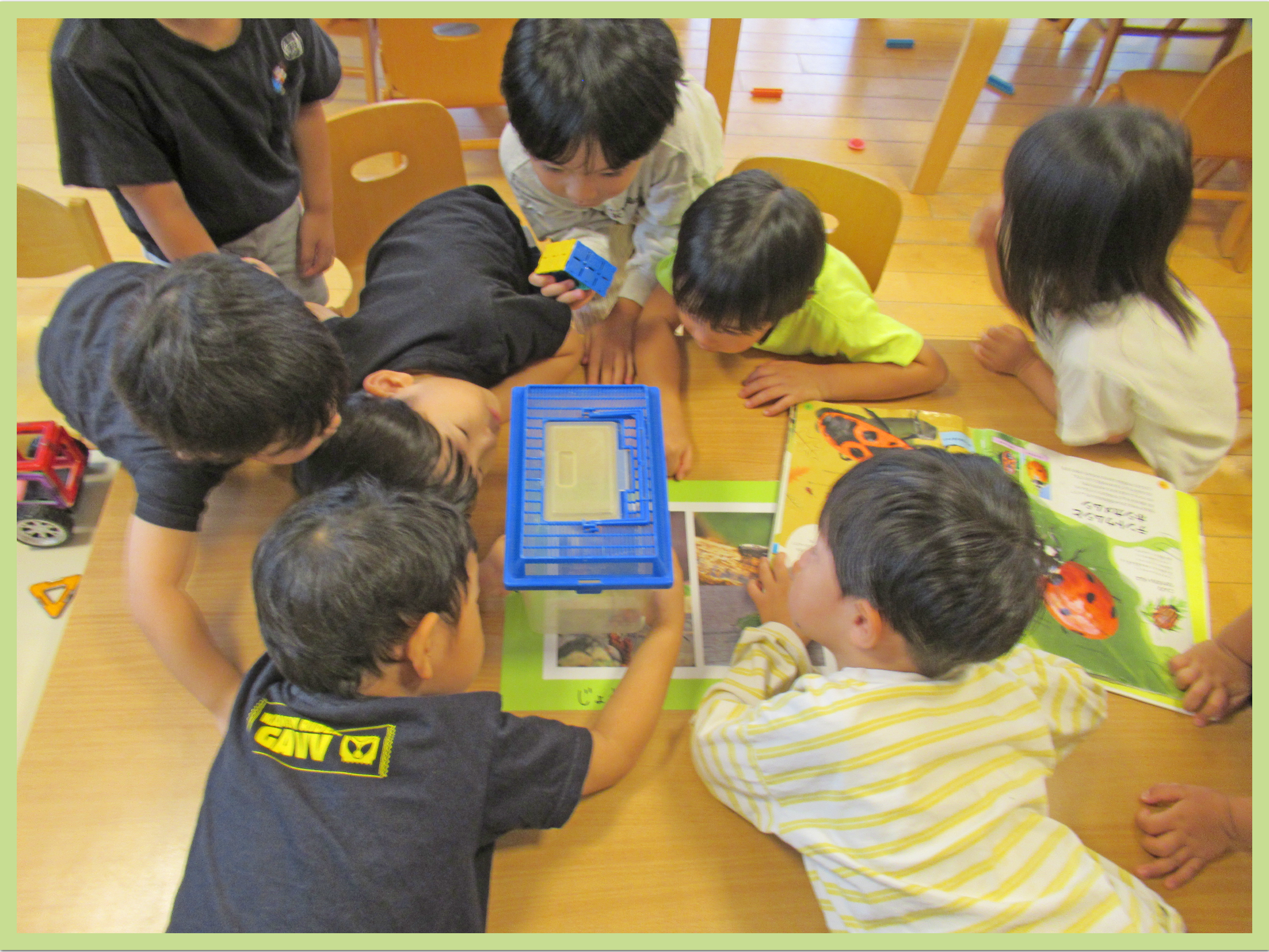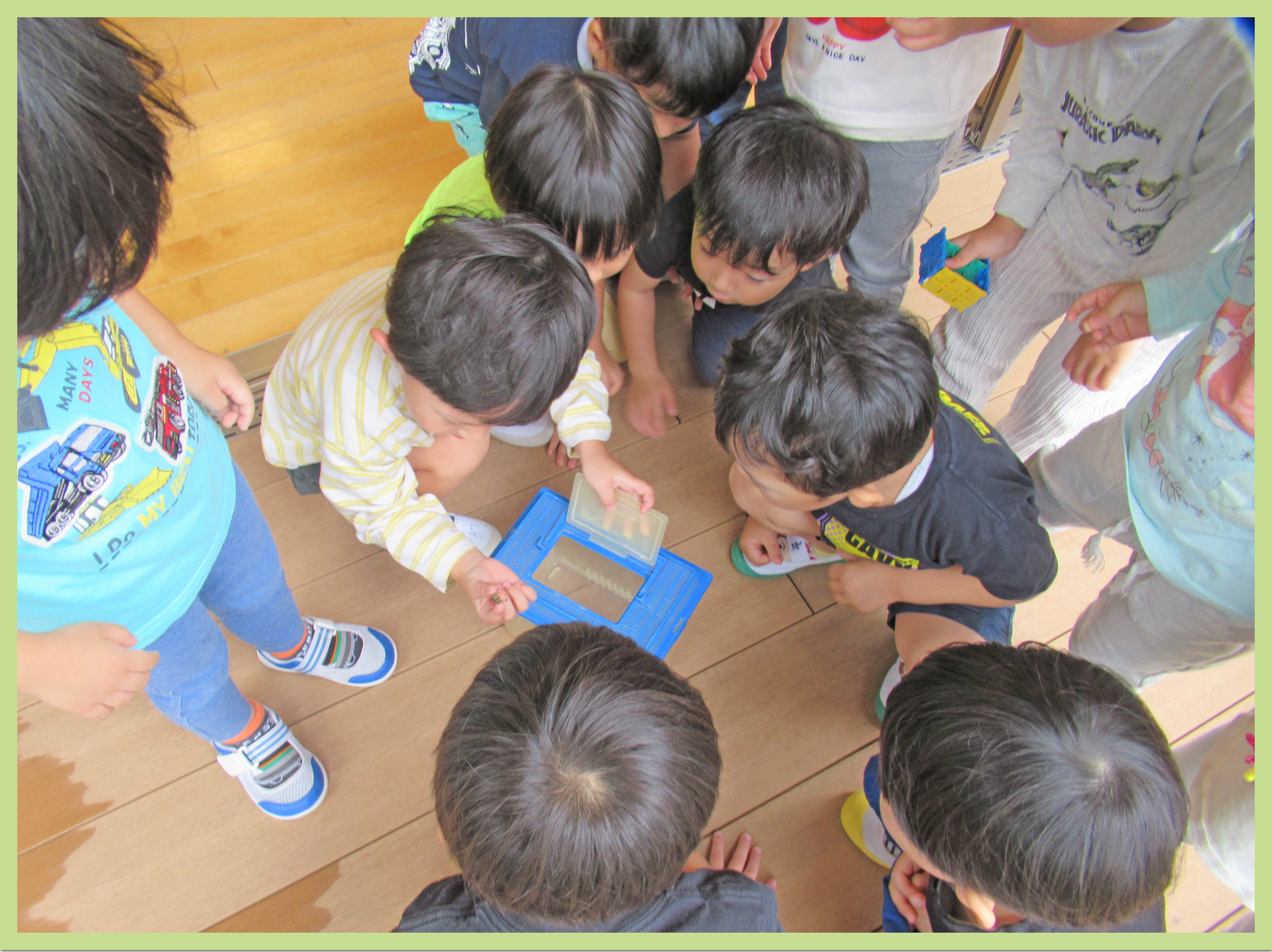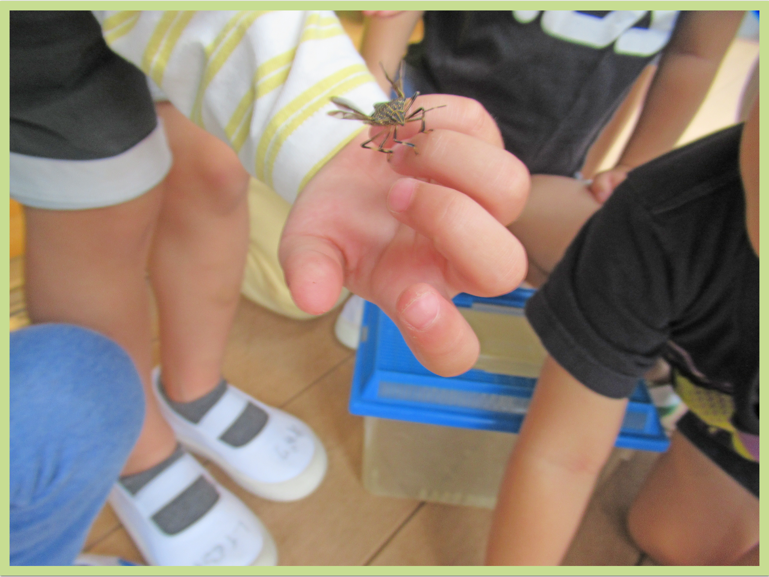 朝の会でカメムシさんとお別れしました。すっかり愛着が沸いたようで「カメムシさん、明日お弁当持ってきてね~!一緒に鮫洲公園に遠足行こうね~!」と声をかける姿があり、微笑ましかったです。