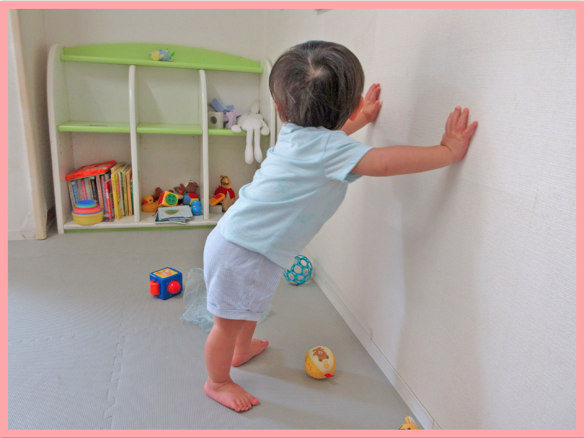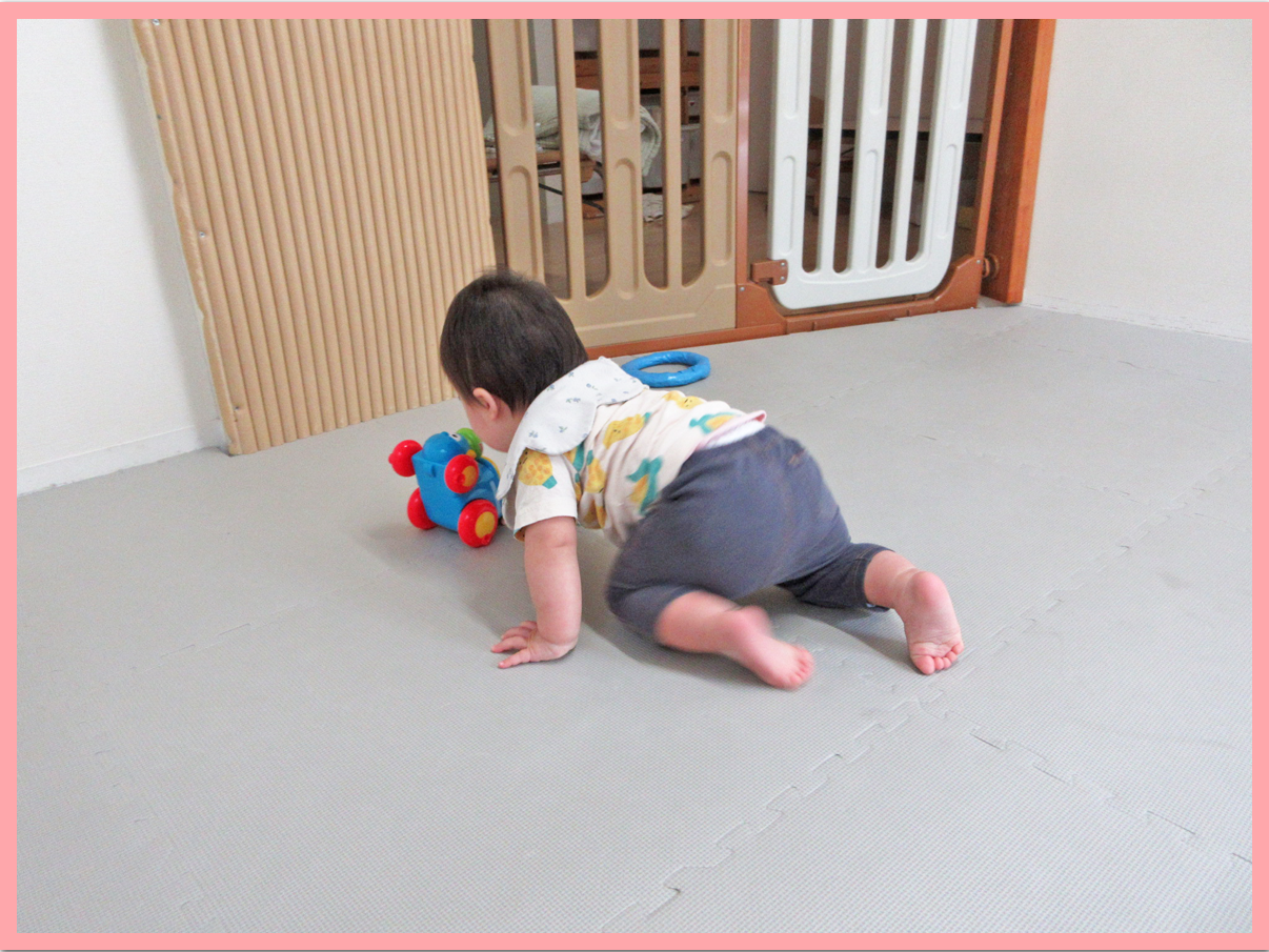 最近のひよこ組はお友だちに興味津々で別の遊びをしていても近くで遊ぼうとしています。泣いているお友だちがいると顔をのぞき込んだり玩具を渡してあげたり優しい一面も見られるようになりました。また、伝い歩きや歩行の動きも練習中で保育室を毎日活発に動き回っています。