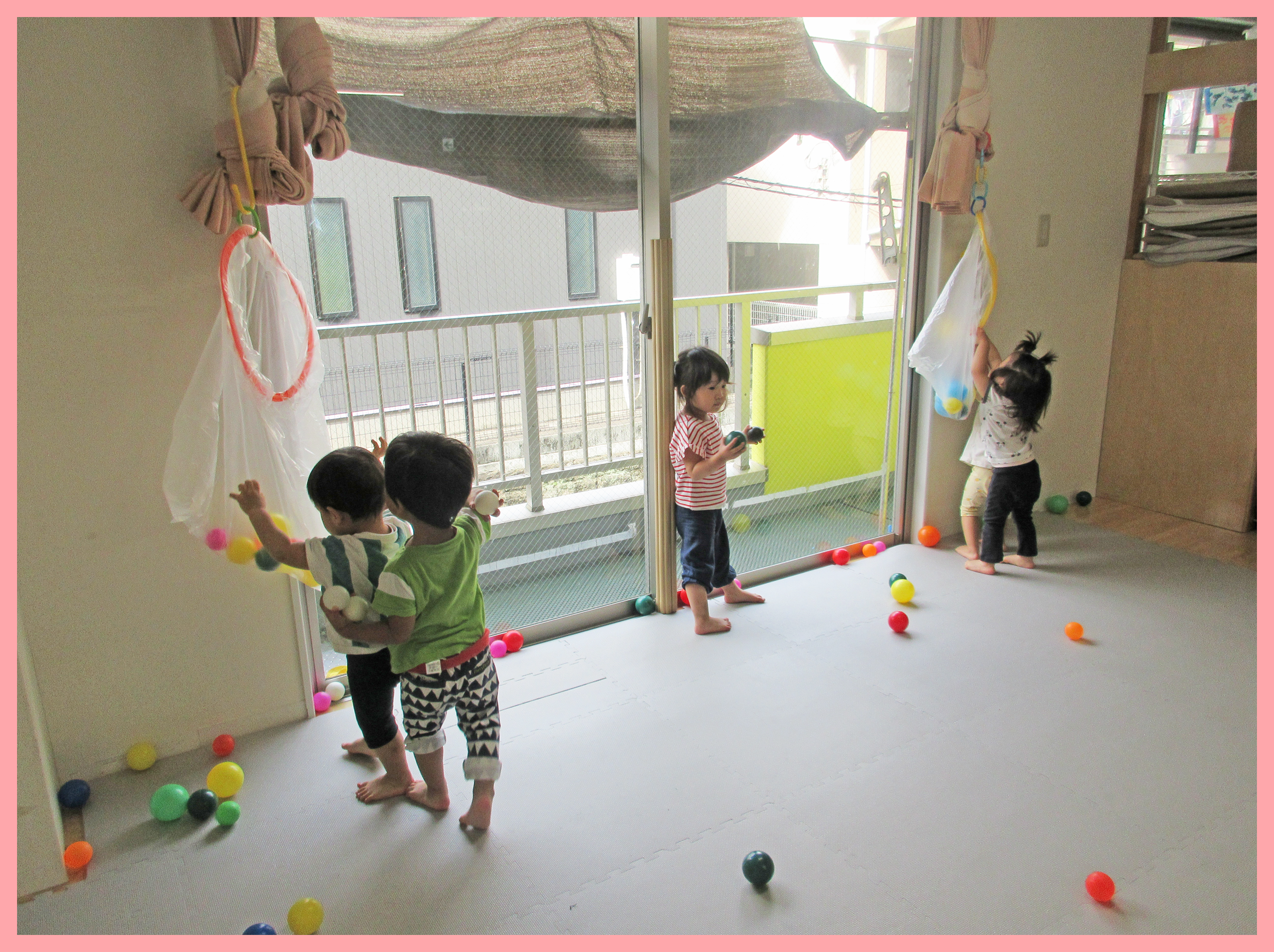 「それっ」と言いながら、袋めがけてボールを入れ、入ると「入ったー」と喜んでいました。