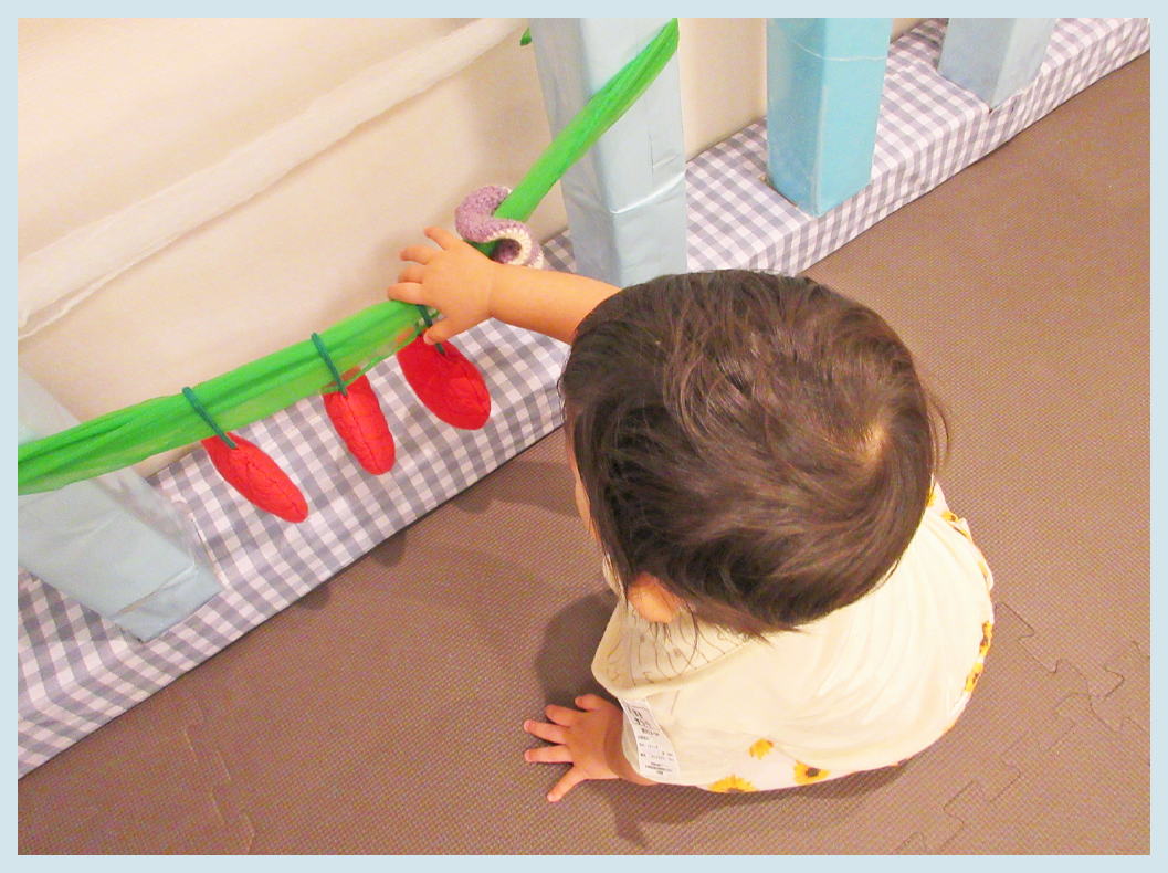 牛乳パックで作った柵に、リトミックスカーフで付けているリンゴに興味を示して手を伸ばし、握ったり引っ張ったりしています。