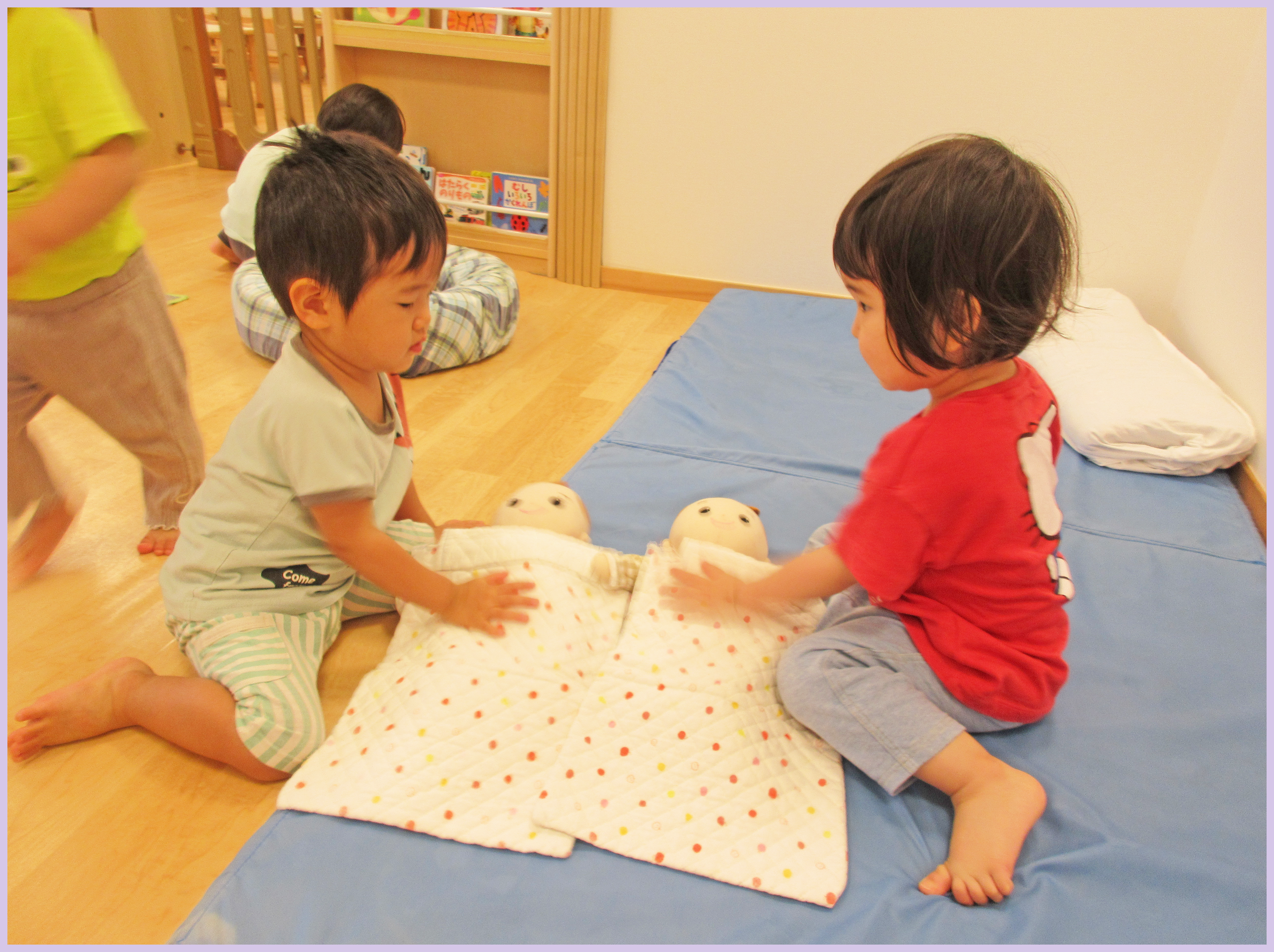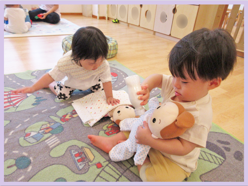 1歳児(かぜ組)がぬいぐるみのお世話をしている様子をお伝えします。