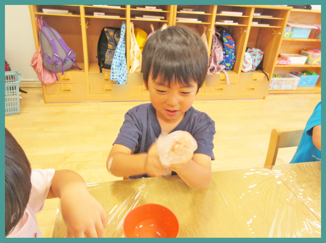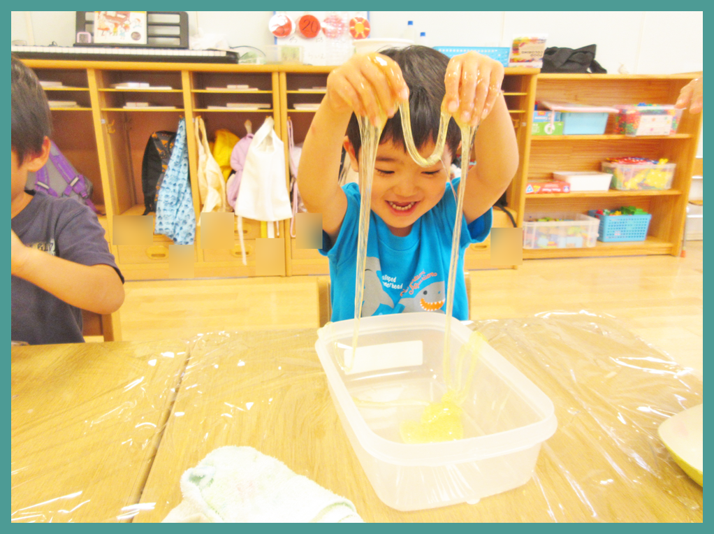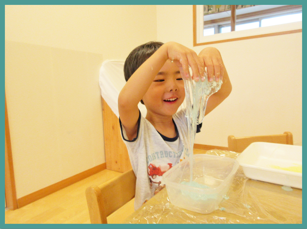 夏の期間は色水や氷、寒天などいろいろな感触遊びを楽しんだこどもたち。もう一度やってみたい感触遊びを聞いてみると一番多かった意見がスライム遊びでした。楽しみにしていた2回目のスライム遊びの様子を紹介します。
