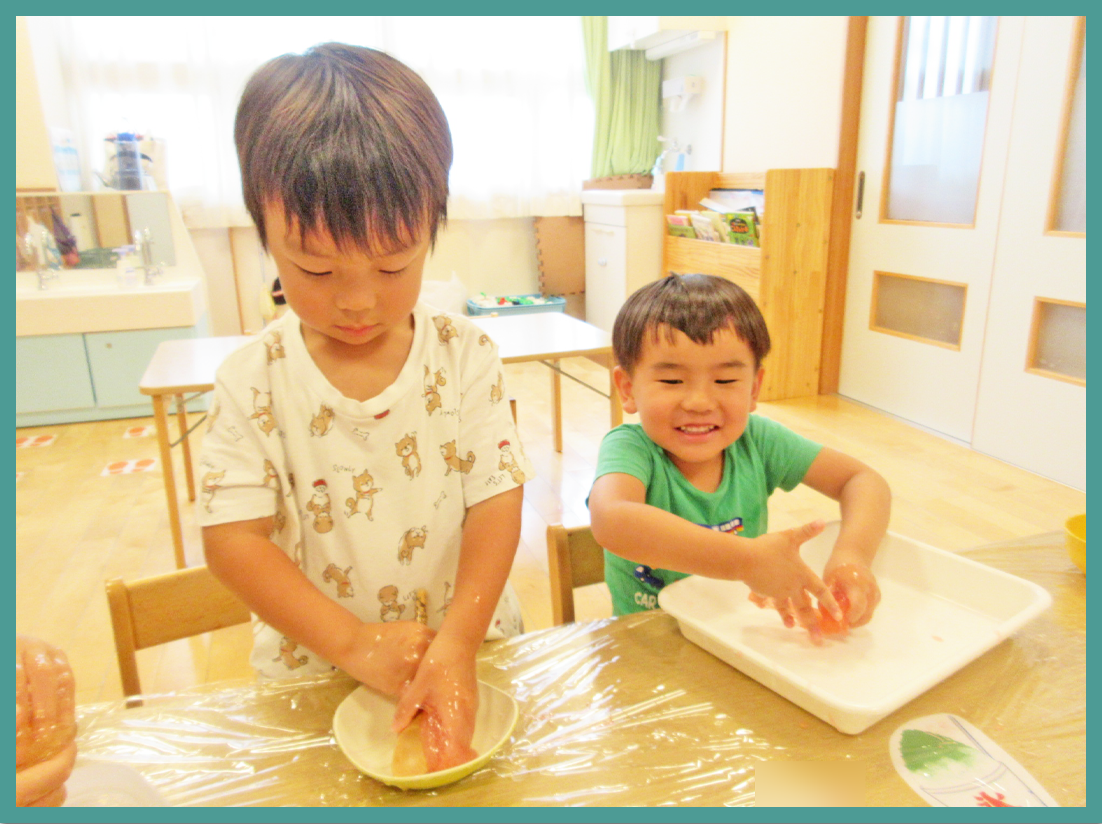 初めは柔らかい感触に不思議さを感じる姿がありました。しばらくこねたり、伸ばしたりしていく過程で面白い形を見つけ、友だちと見せ合いながら遊んでいました。