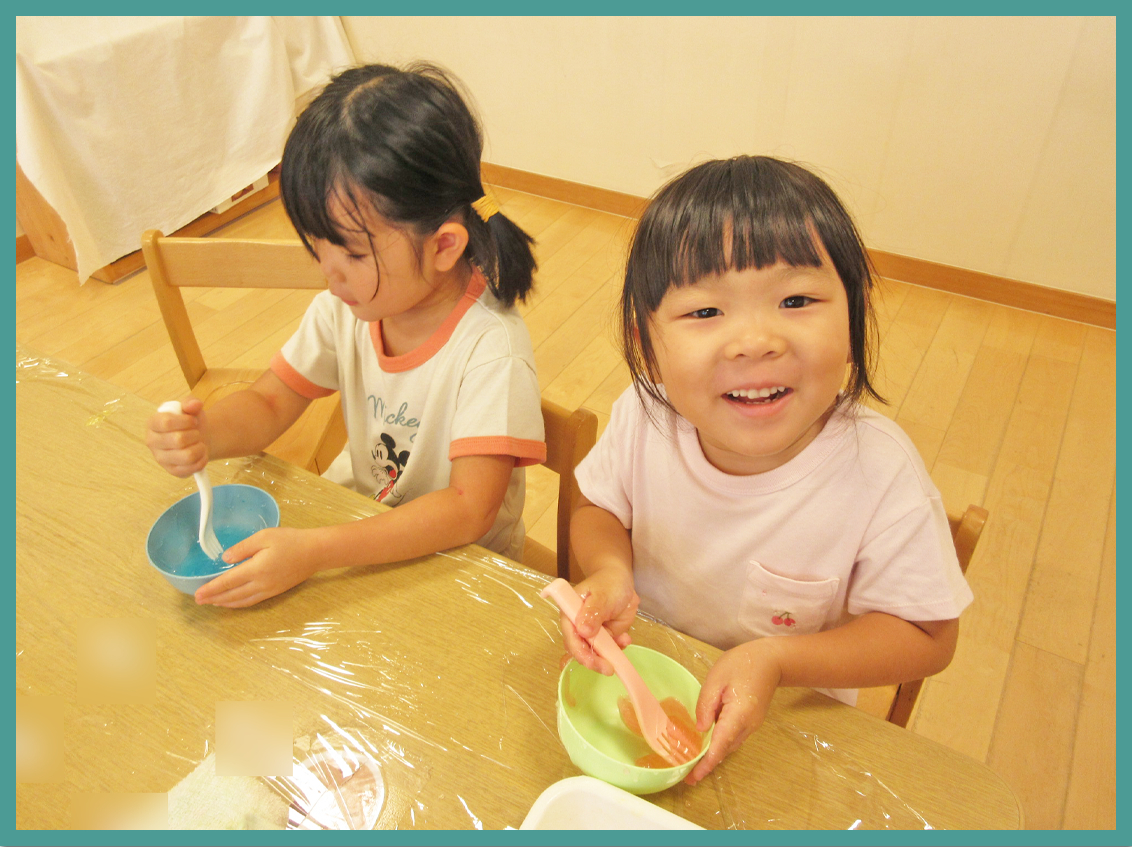 また、食紅で好きな色のスライムに変え、スプーンやフォークを使ってかき混ぜたり、取り分けたりしながら、遊びが広がっていく姿がありました。