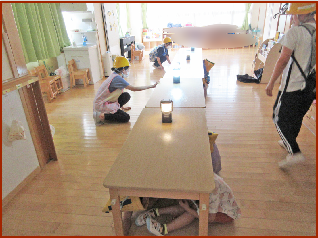 2歳児から5歳児まではテーブルの下への隠れ方、テーブルがない時の身の守り方を確認しました。慣れていない2・3歳のこどもたちも年上のお友達の様子を見て一生懸命に取り組む姿が見られました。