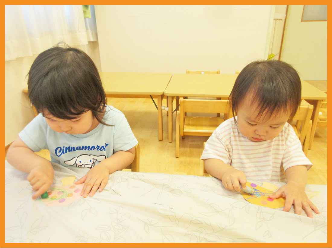 季節にちなんできのこ製作を行いました。シールを好きな場所に貼ってみたり、お気に入りの色のクレヨンを選んでグルグルと描いたりしてオリジナルのきのこを完成させていました。