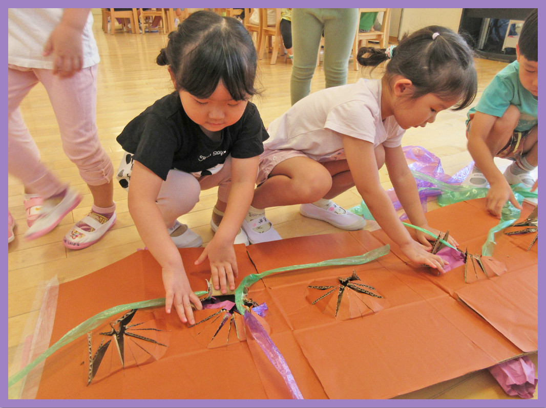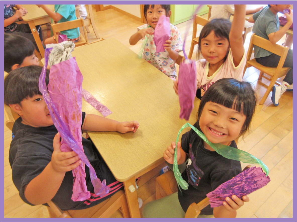 10月の芋掘りに向けてそら組とたいよう組でどのくらい大きなさつまいもが育っているのかさつまいもがどんなふうにして土の中にいるのかを、想像しながらさつまいもを作ったり、いもほりごっこを楽しんだりしました。