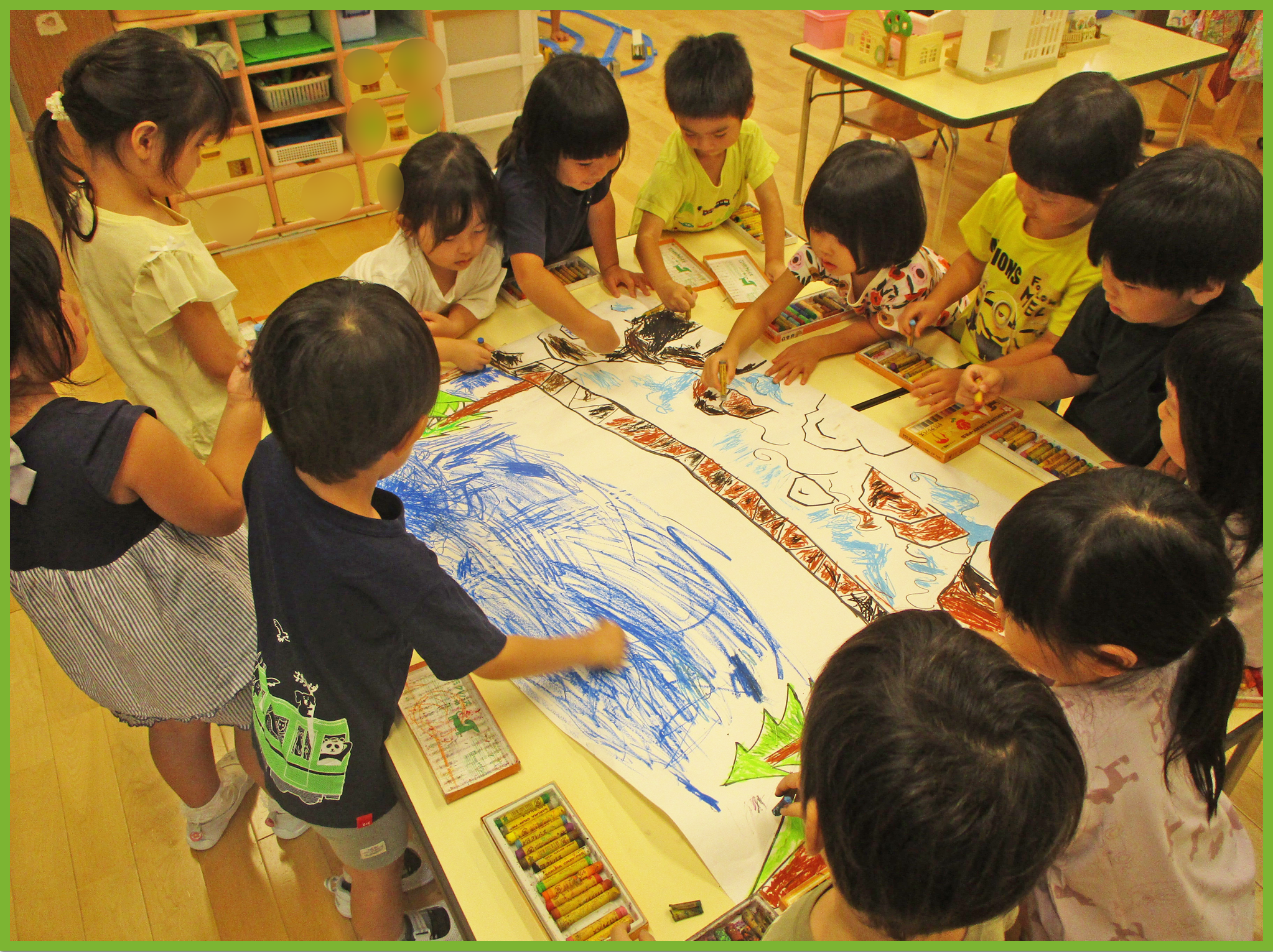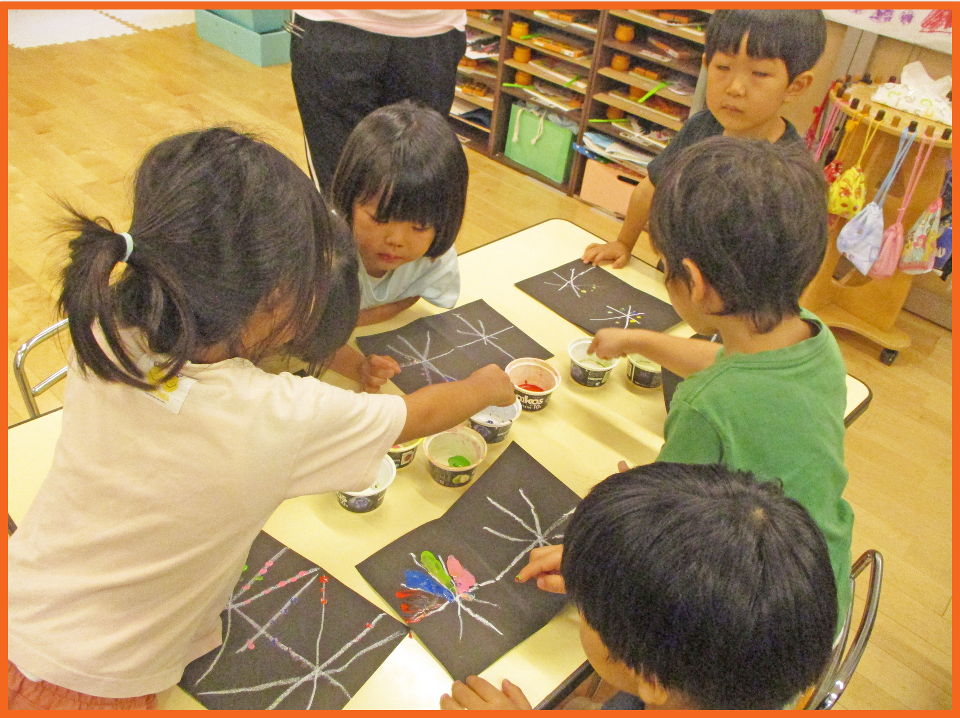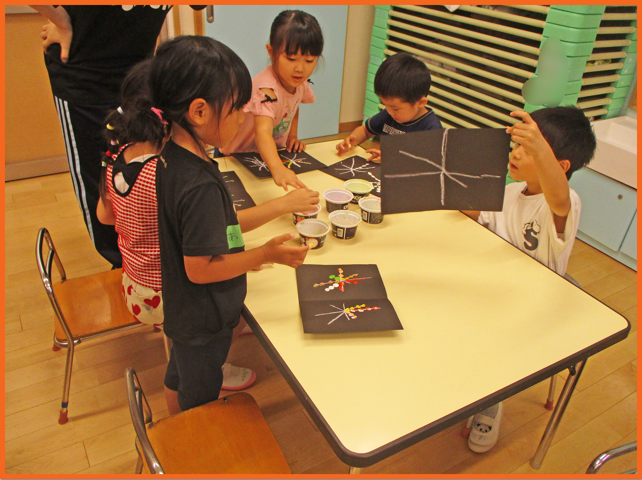 線を描いたり、点をつけたりで色とりどりの花火ができました