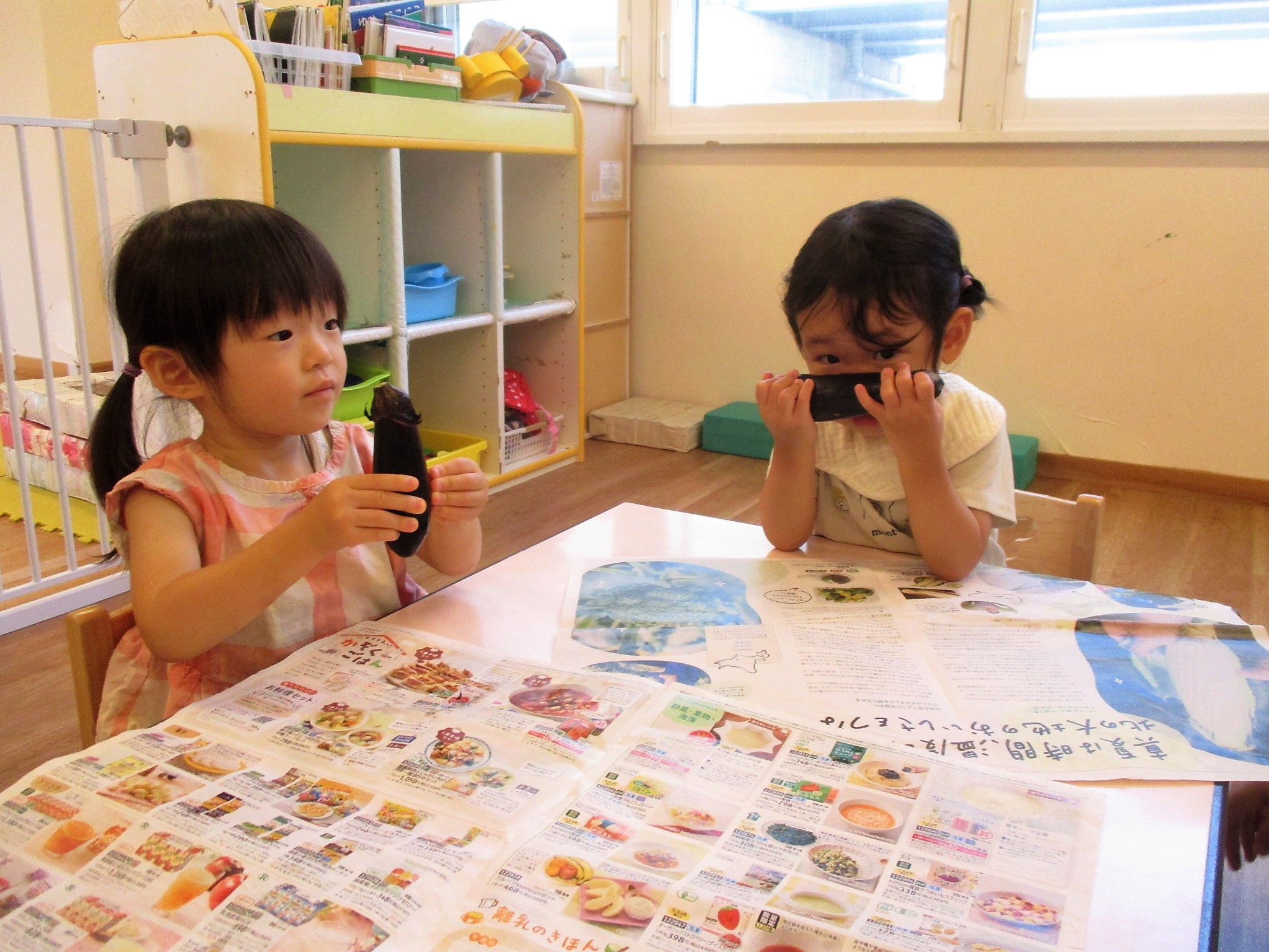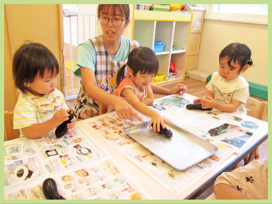 野菜の絵本を見た後にナスを触ってみました