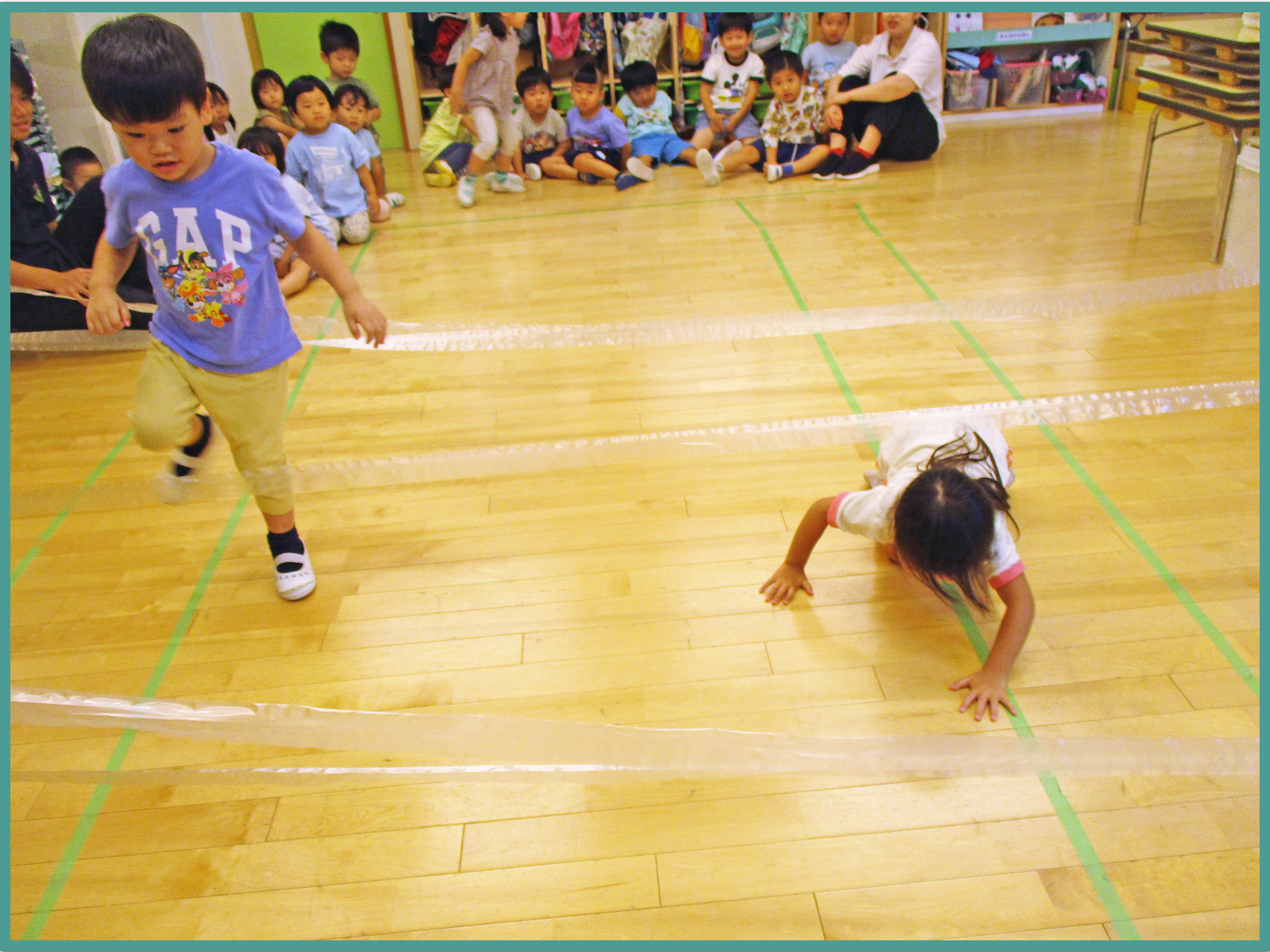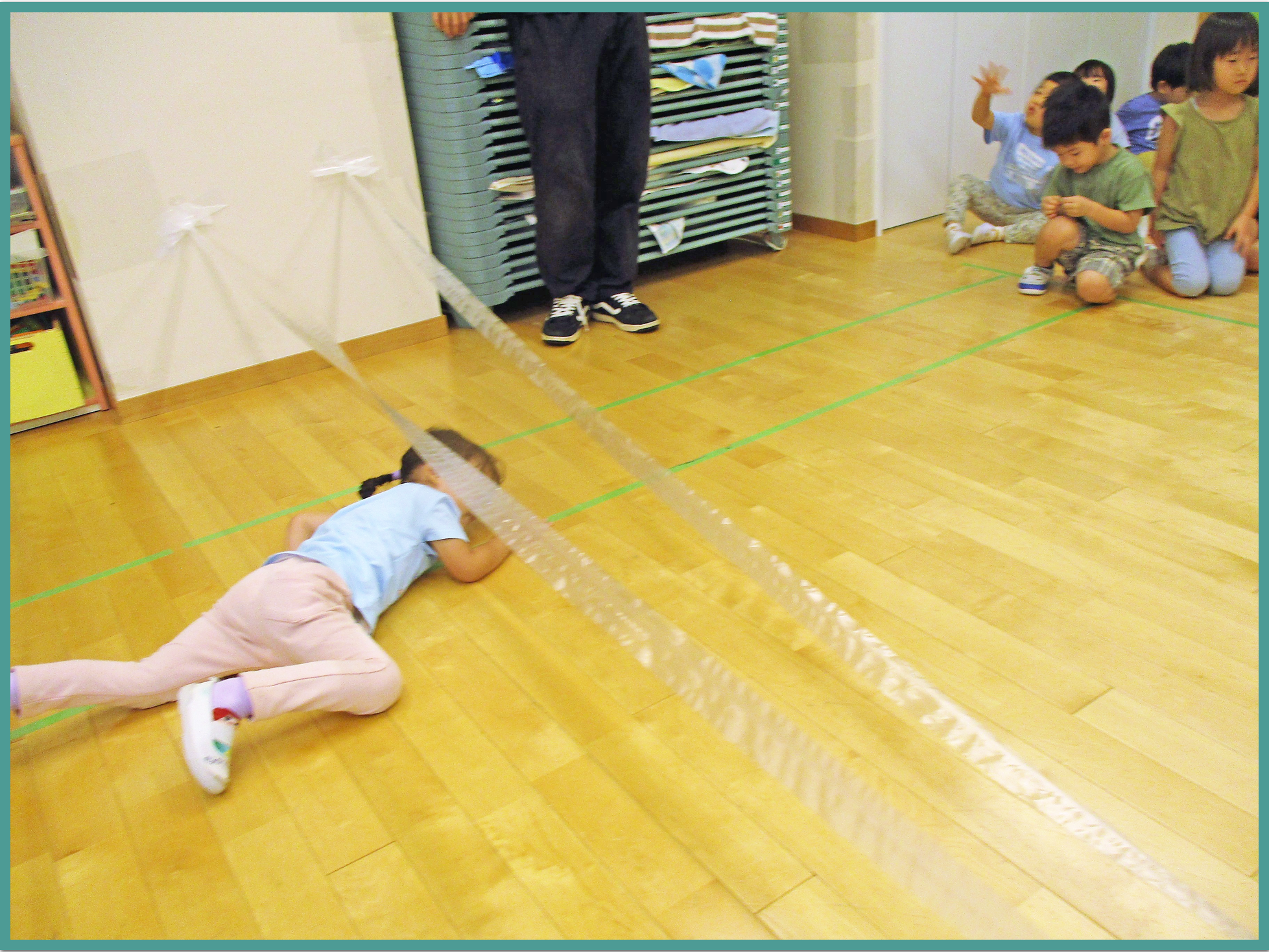 保育室に平テープを張り巡らせて当たらないようにくぐったりまたいだり