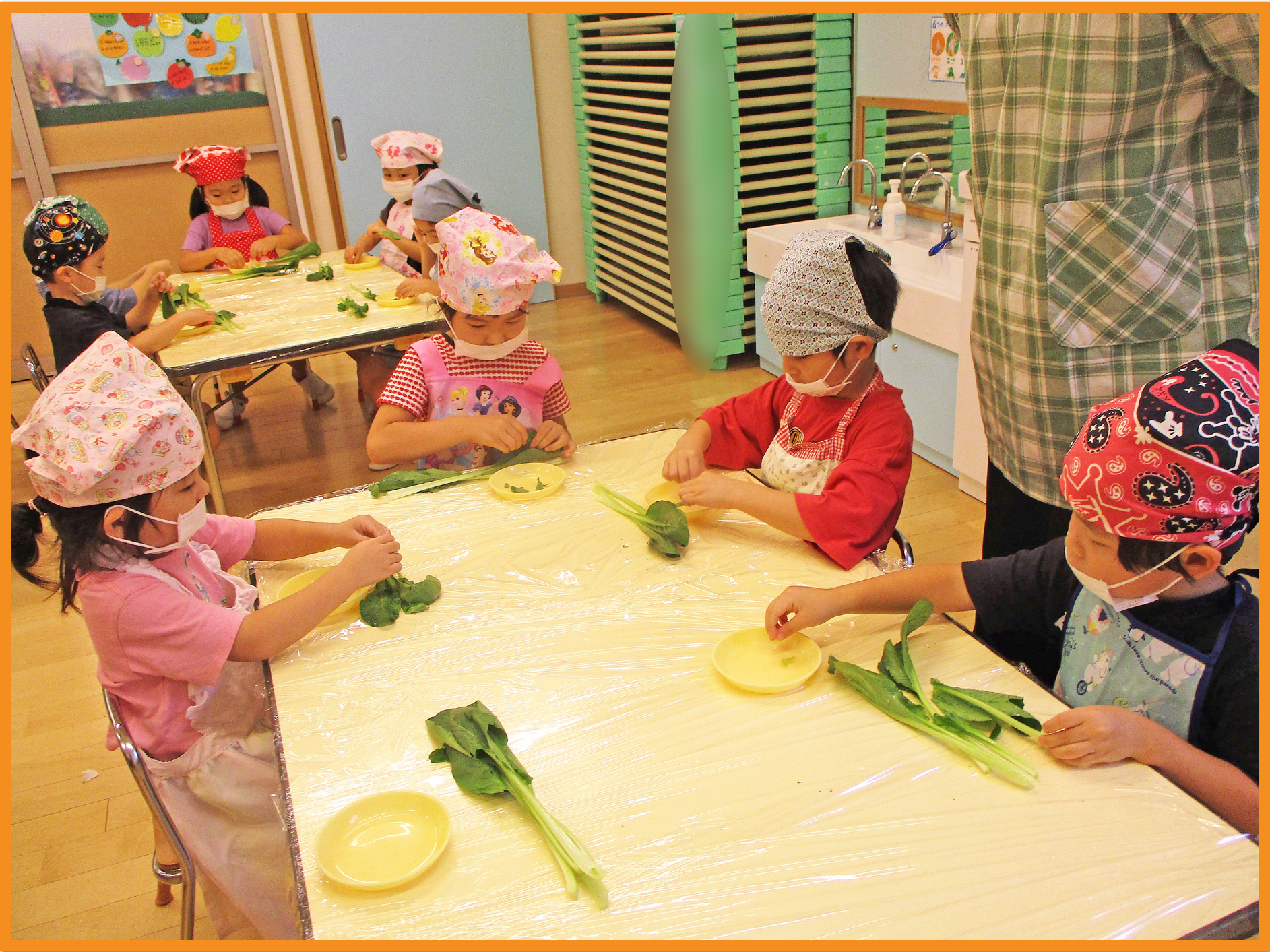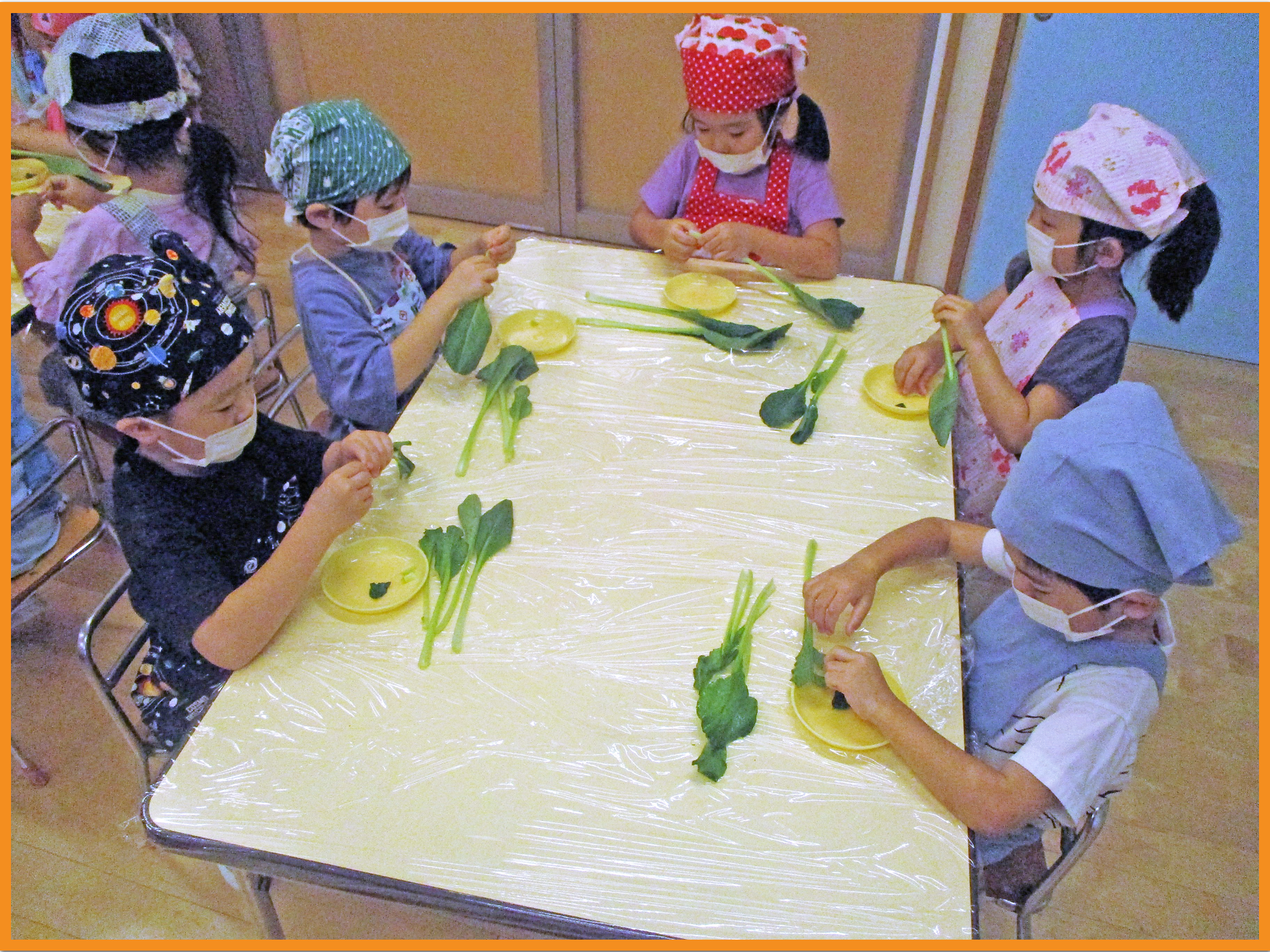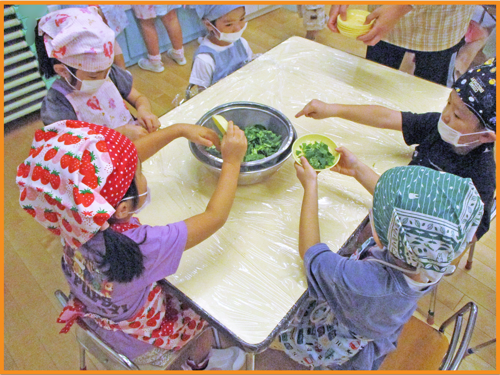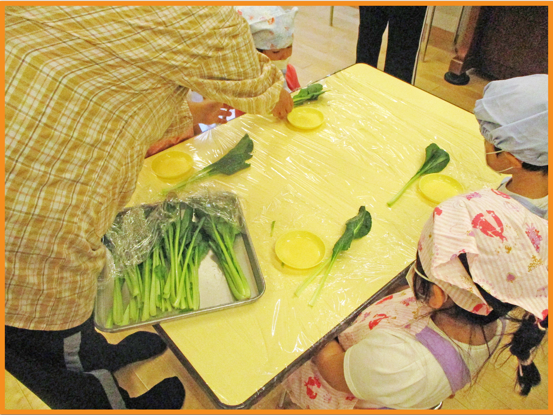 ちっぎた小松菜を目の前で茹で、更に小さく柔らかくなっていく様子を見ました