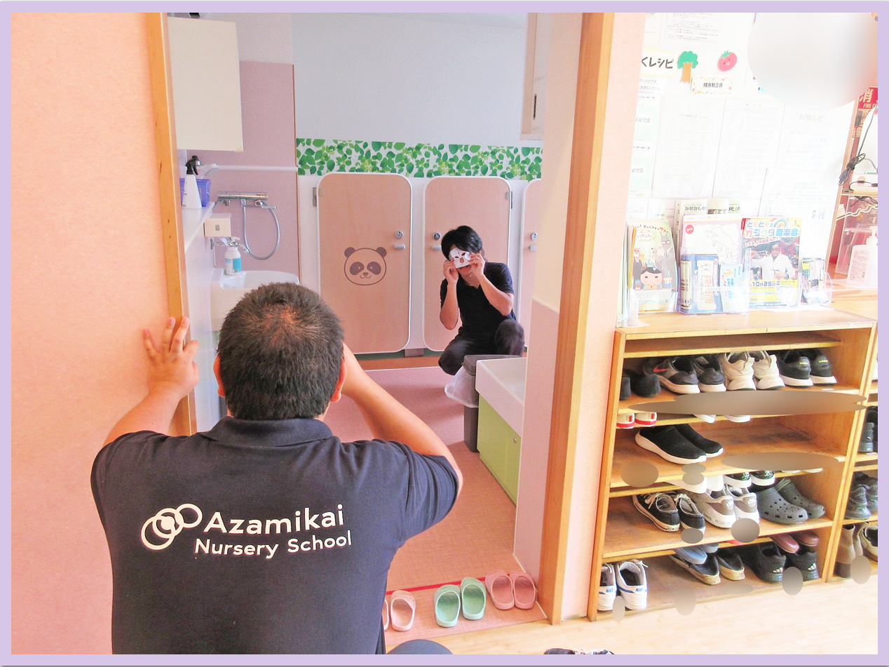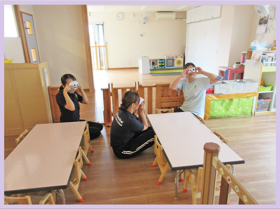 こどもの目線になり、チャイルドビジョン(こどもの視界)を着けて保育室を歩いたり、階段の上り下りをしたり