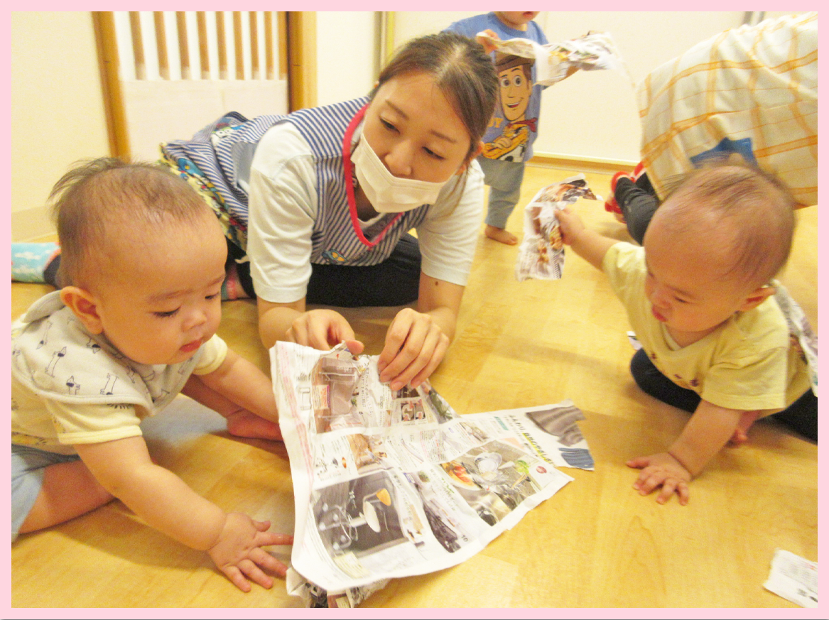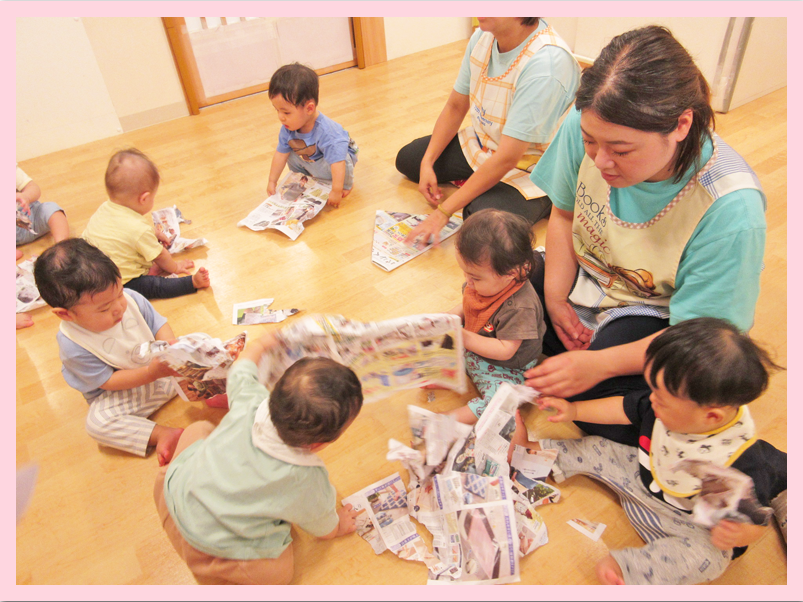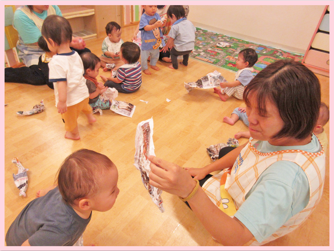 成長とともに興味の幅も広がってきたひよこ組。今日は広告遊びをしました。保育者がちぎる様子を見せると、興味津々になって手に取っていました。一緒にちぎったり丸めたりして
