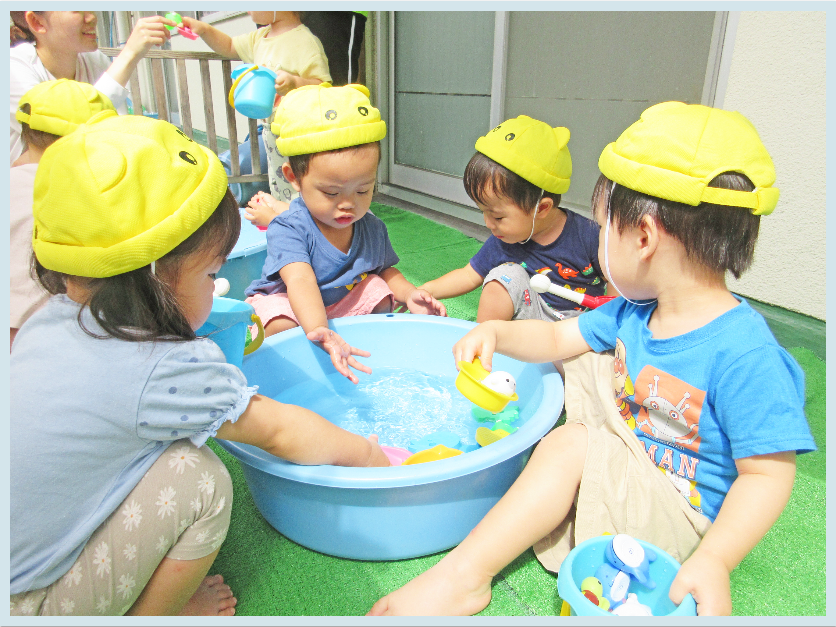 今日は、テラスで水遊びを行いました。金魚やカメを凍らせたおもちゃ氷をたらいに浮かべ、皆で生き物掬いに挑戦です。スコップで一生懸命掬おうとしますが、氷が逃げてなかなか取れず、「うーん」と言いながら一生懸命手を伸ばすこどもたち。1匹、2匹…と掬っていくうちにコツを掴んでくると、バケツいっぱいになるほどおもちゃを掬い、「できた」と嬉しそうに話す笑顔が眩しかったです。お部屋でも、たらいにおもちゃ氷を入れて感触遊びを楽しみました。
