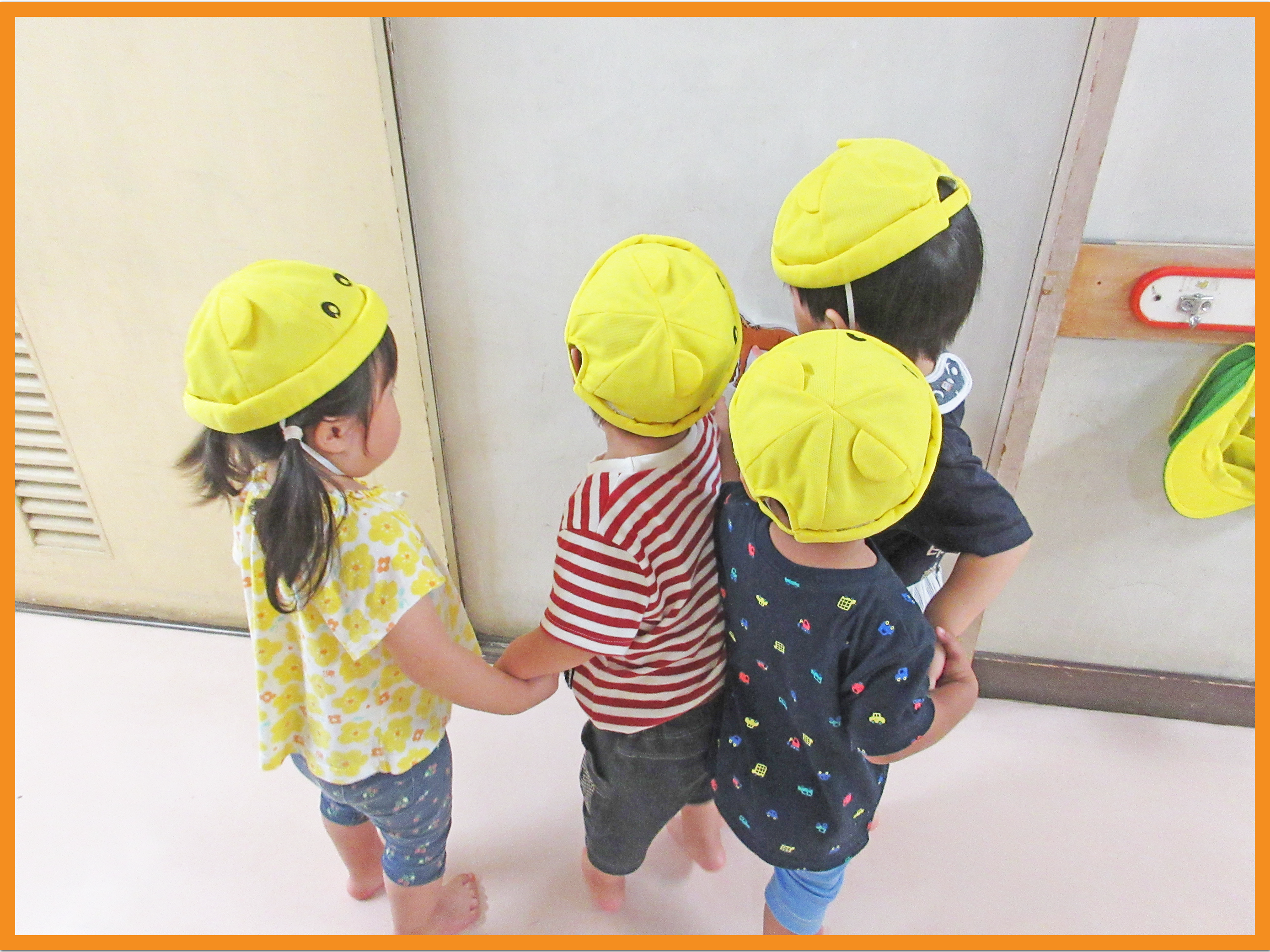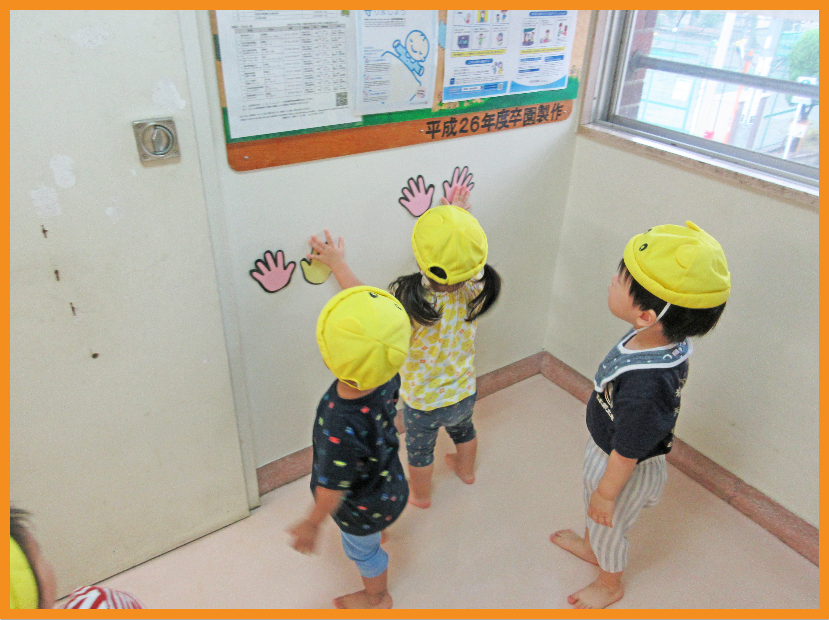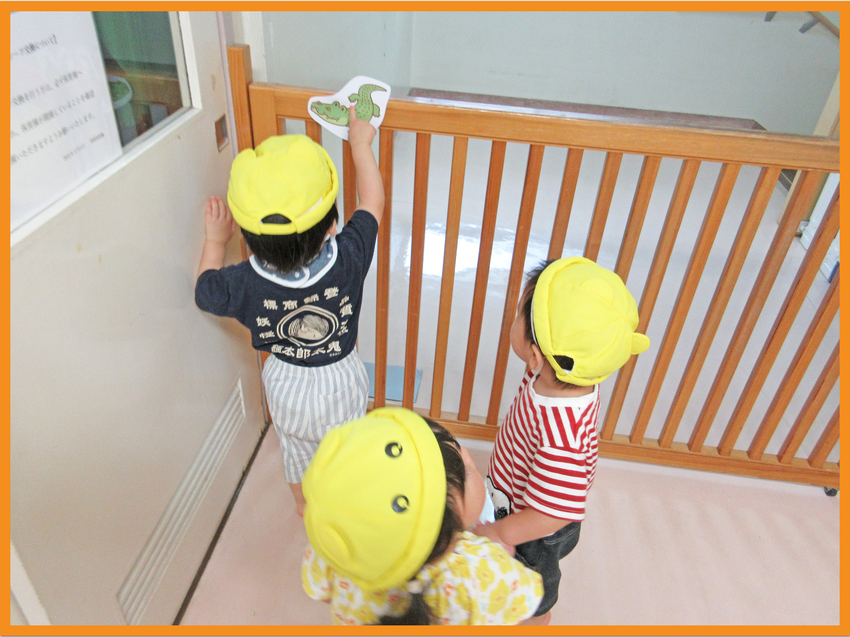 今日は、廊下に動物のイラストを貼り、みんなで動物探しをしました。「あった」とすぐに指をさして「ぞう」や「きりん」「ごりら」などを見つけました。保育者が動きや声を真似していくと、みんなも真似っこをする姿がとても可愛らしかったです。途中タッチのイラストがあり、自分の手のひらをくっつけて「たっち」とご機嫌にハイタッチをしていました。