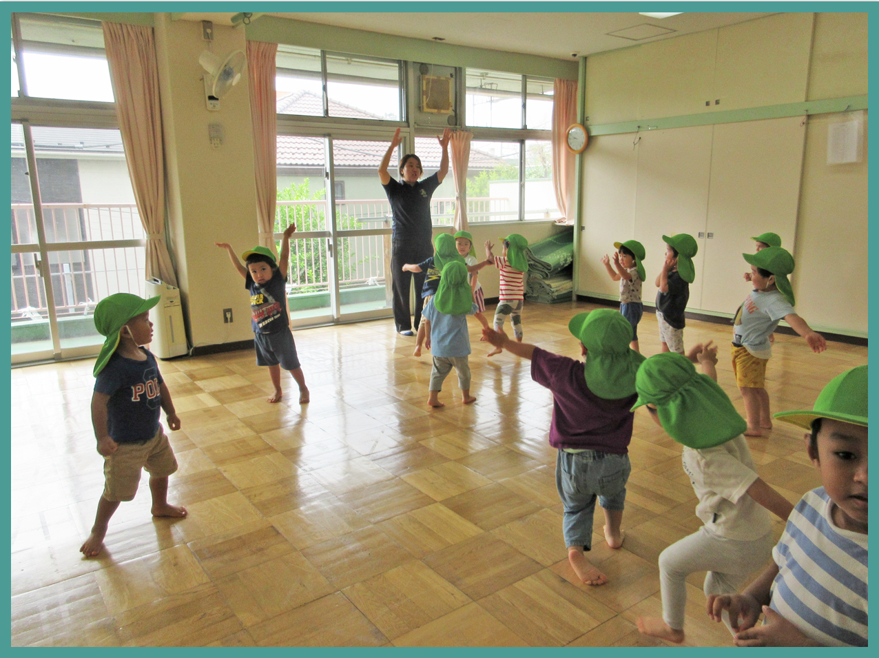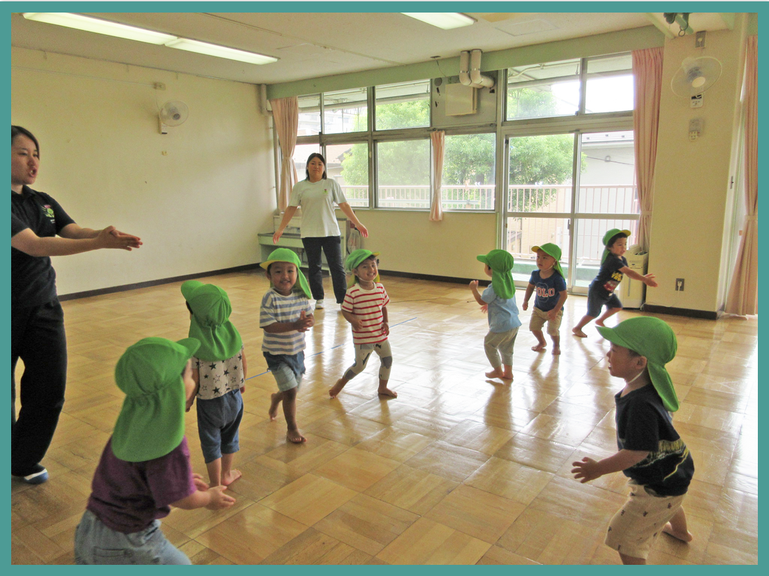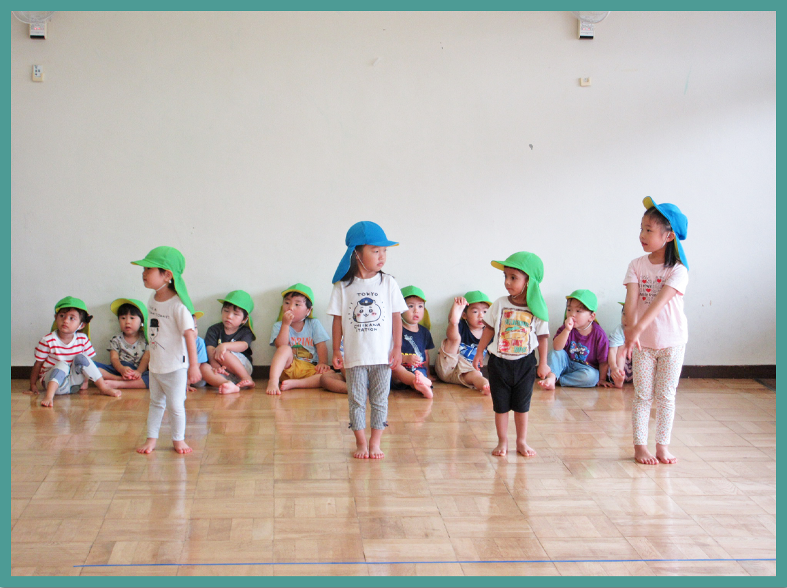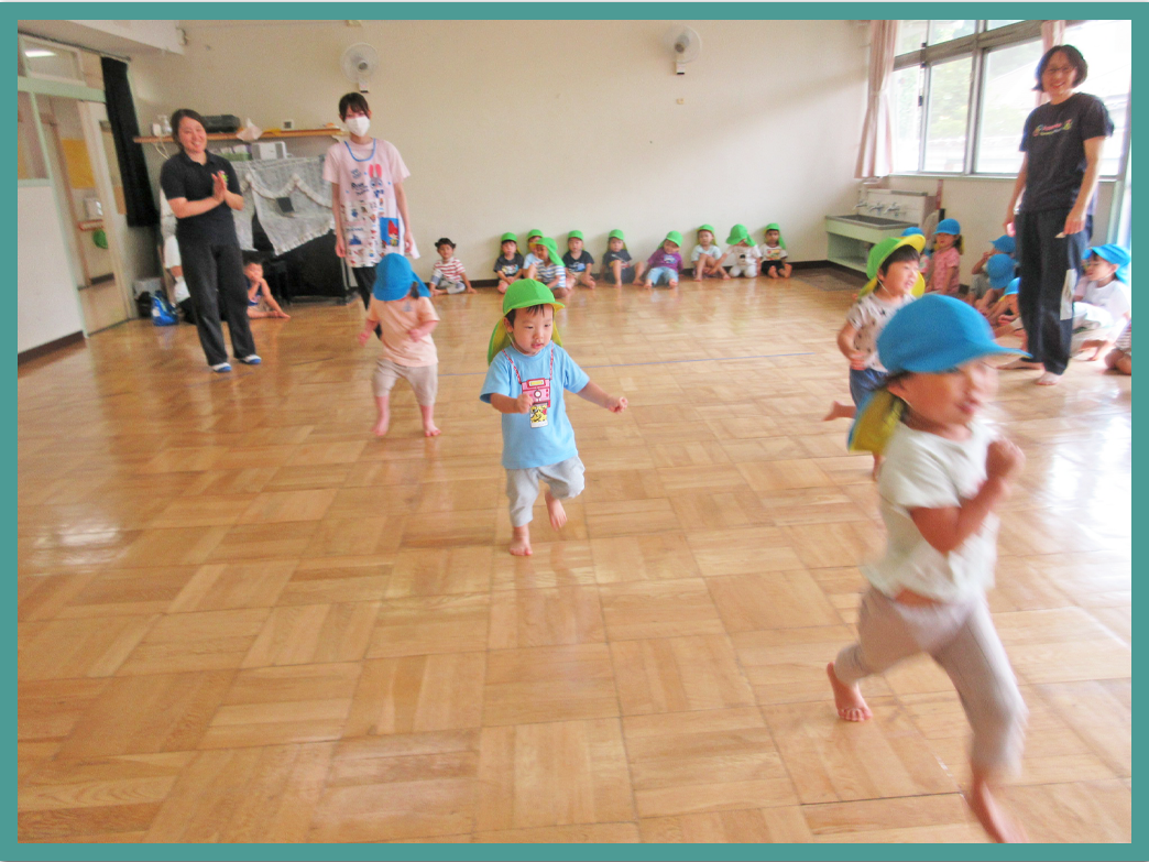 ホールでペンギンのダンスやかけっこをして体を動かして遊びました。ペンギンが「スイスイ」と泳いだり、跳んだりする動きを繰り返し楽しんだ後に、かけっこを行いました。3歳児と一緒にかけっこを行い、ゴールに立つ保育者のところまで一生懸命に走っていました。