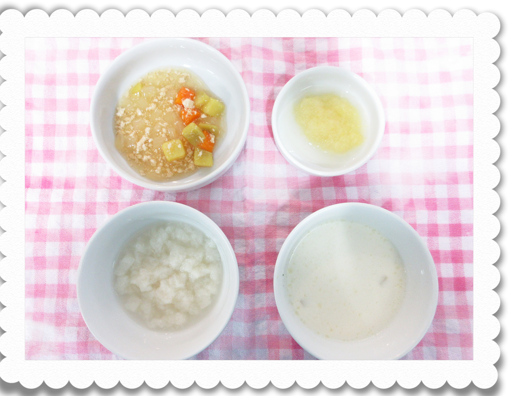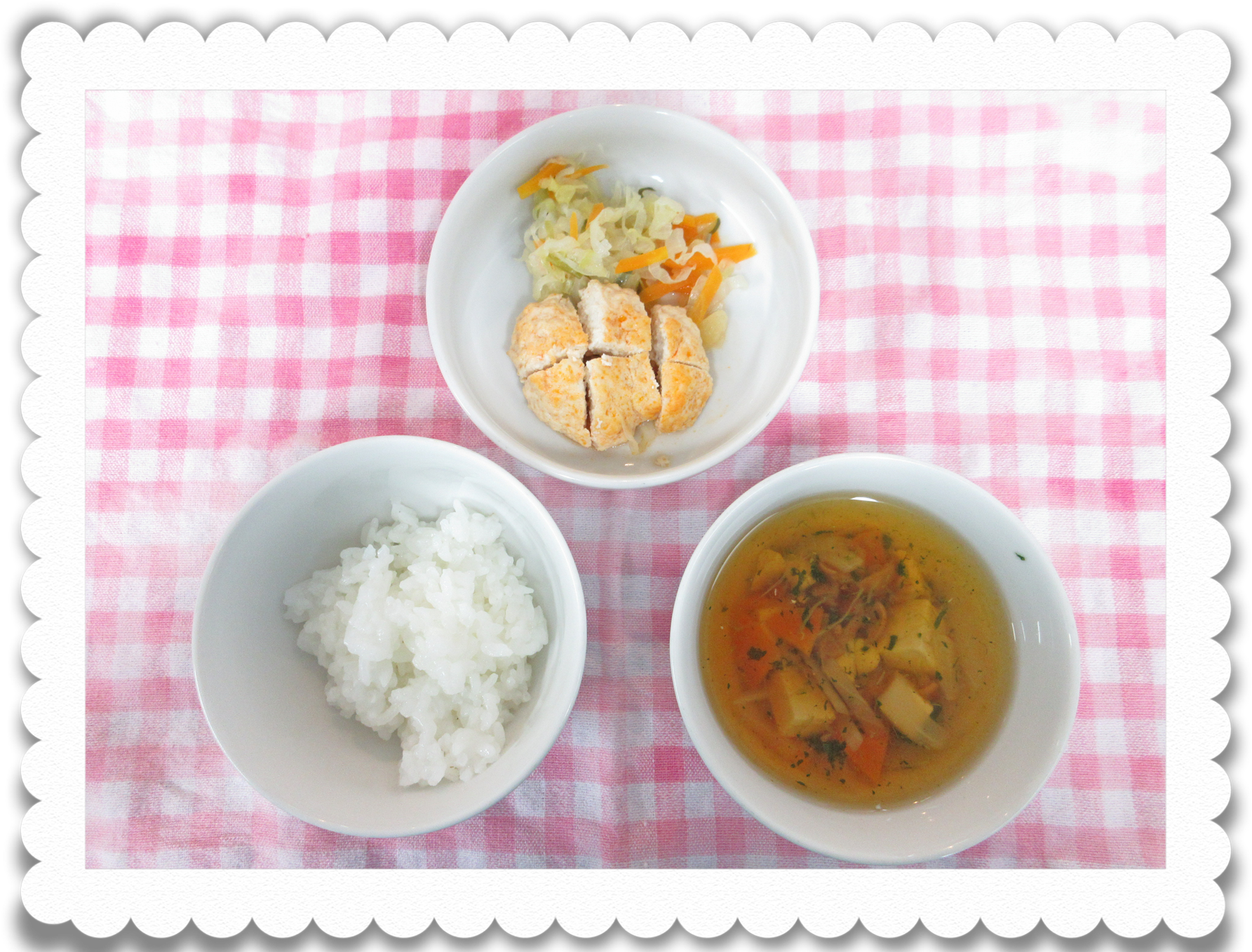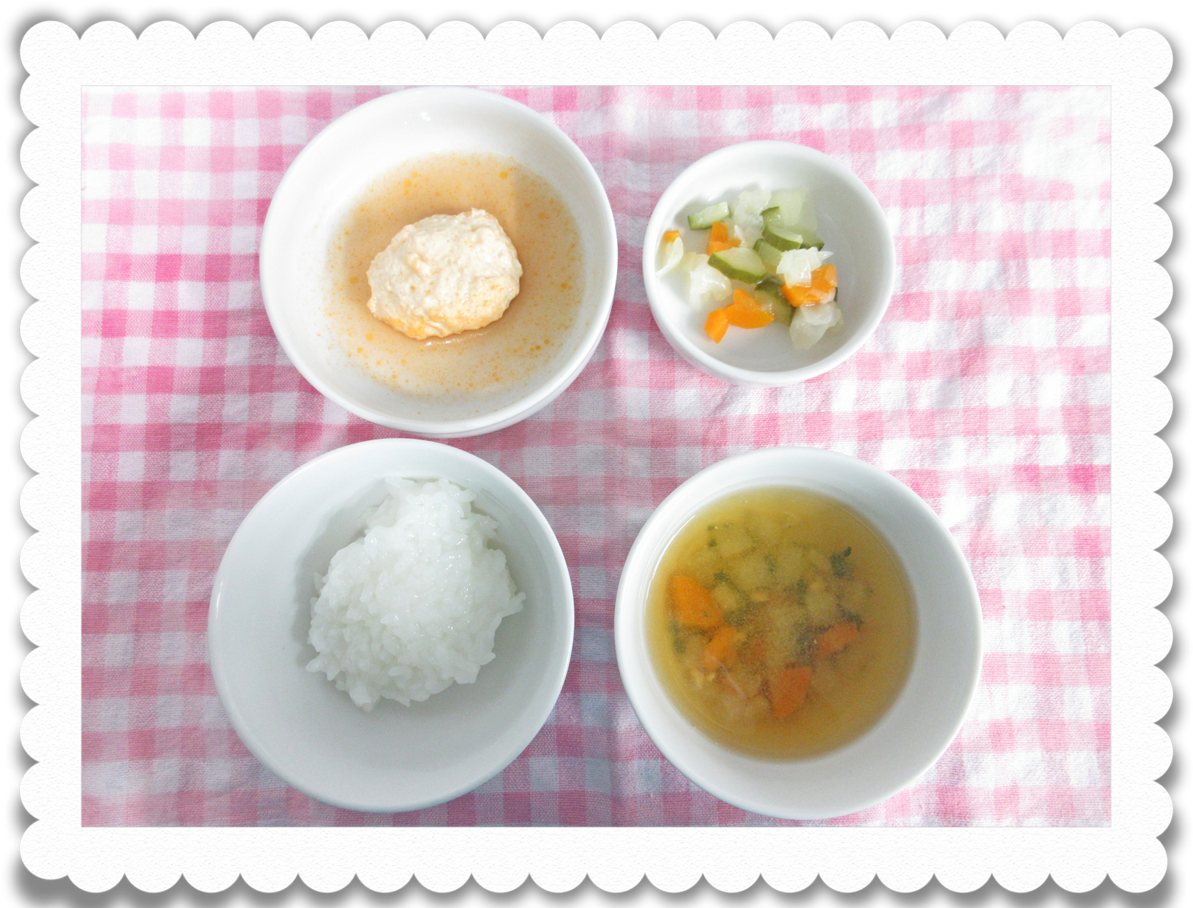 午前食:硬粥、焼きつくねのケチャップ煮、野菜あえ、玉ねぎスープ