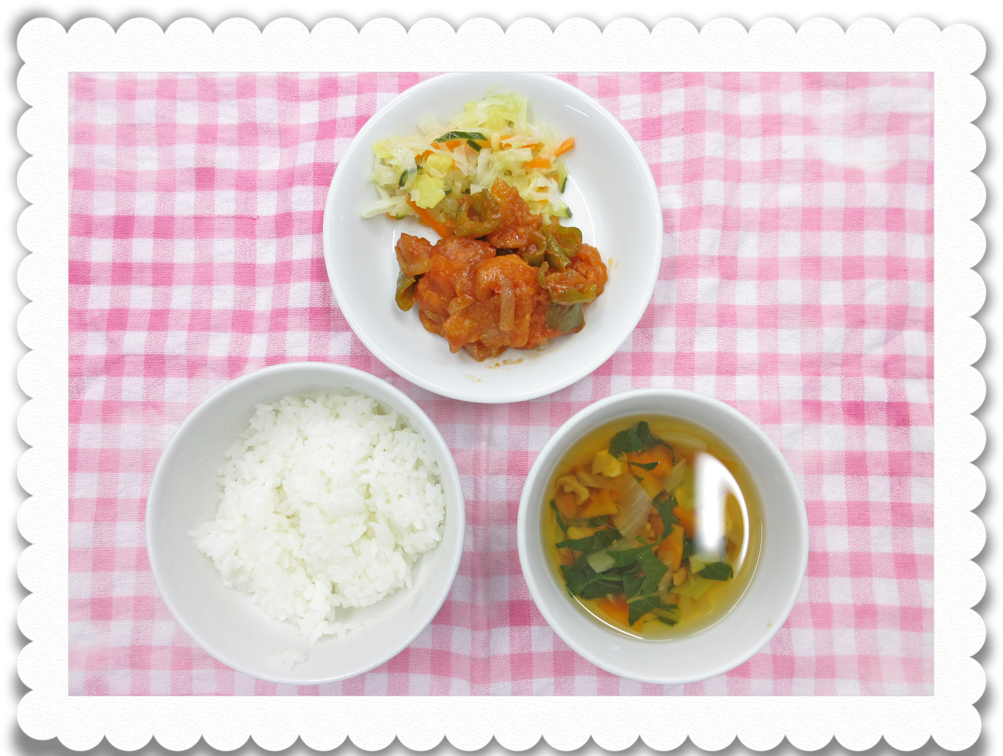 【幼児給食】ご飯、鶏肉のケチャップ煮、ハワイ風サラダ、なめこスープ