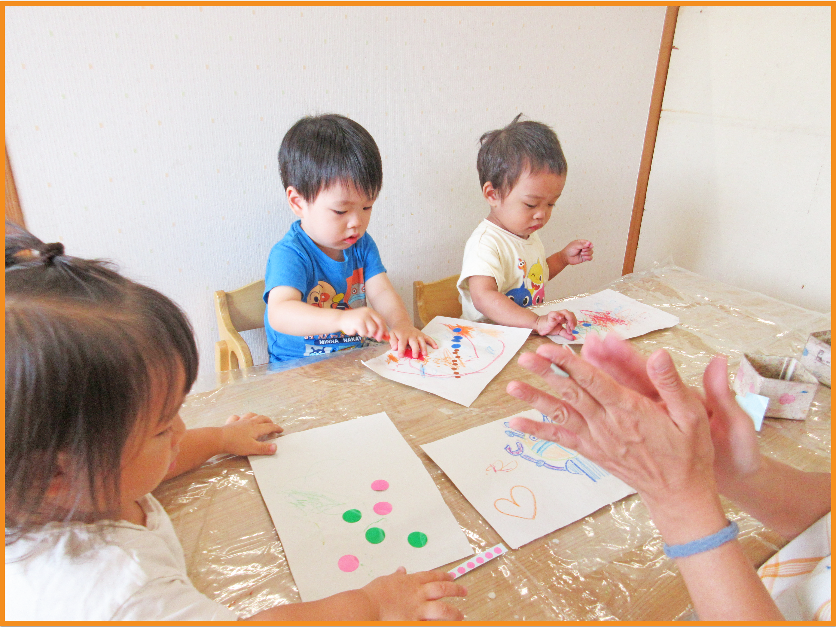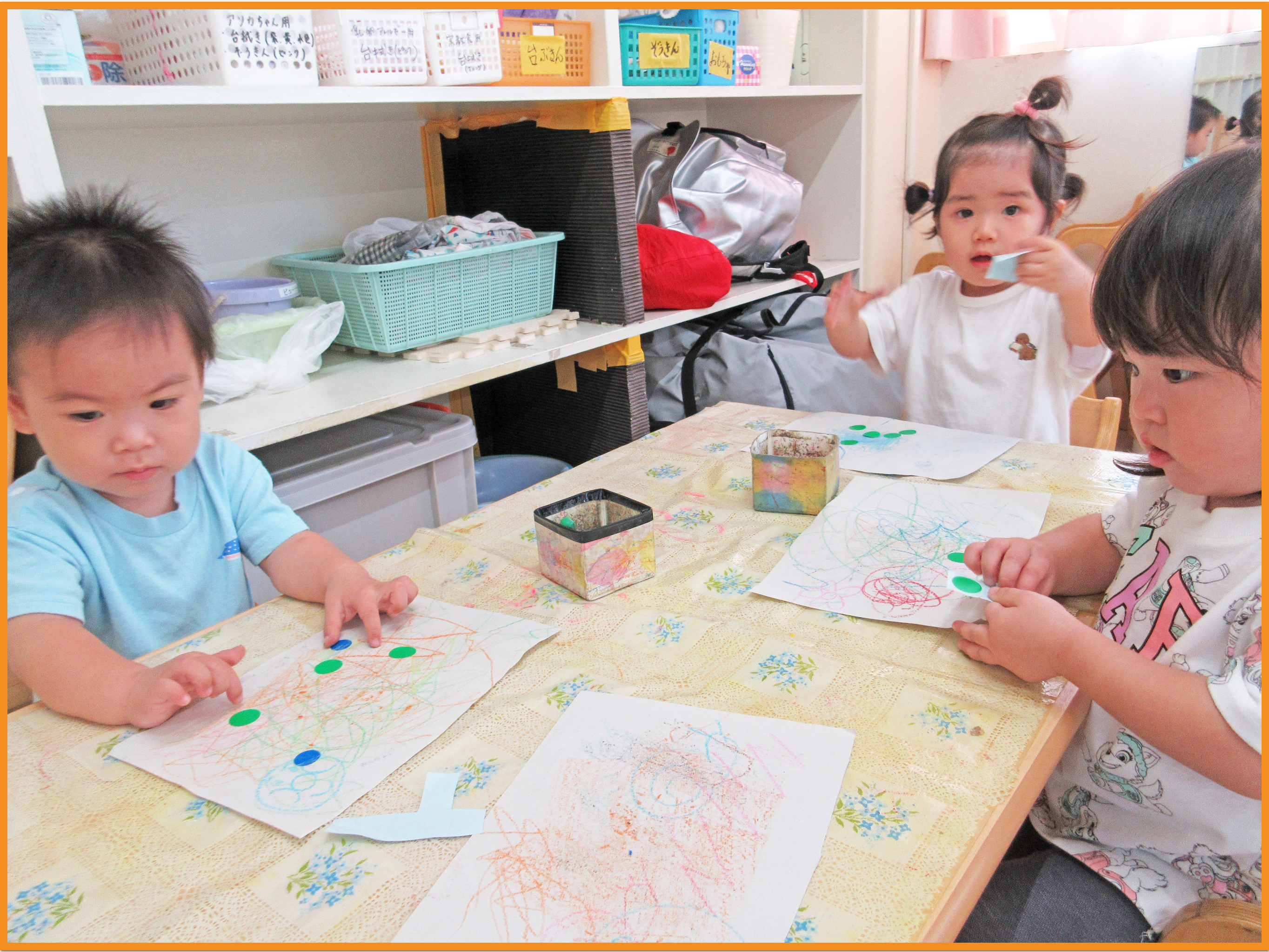 トントンとクレヨンをリズムよく押し当てて楽しそうに描いている子もいて、完成すると「あめ、できたー」と嬉しそうに見せてくれました。