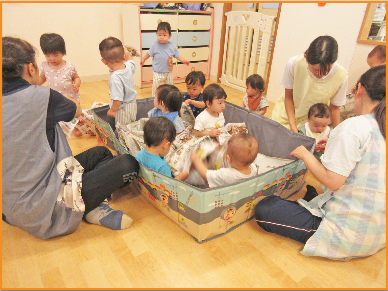 0歳児 ひよこぐみ「園内探索」「新聞紙プール」