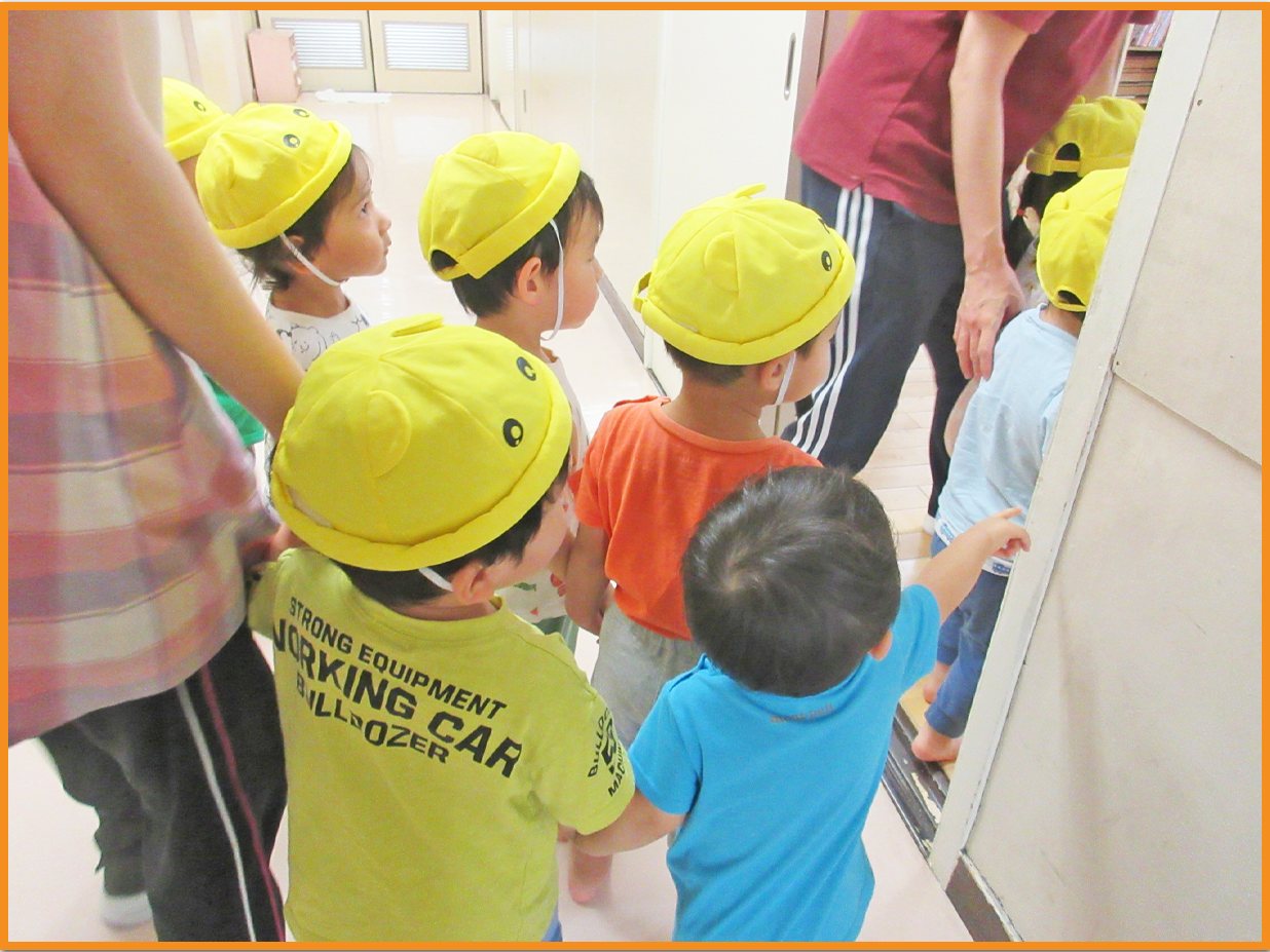 初めての園内探索は、こどもたちは緊張する姿がありましたが、お兄さん、お姉さんを見ると笑顔になり、手を繋いでもらうと嬉しそうな表情を見せていました。
